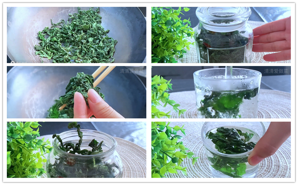直至把叶子炒得干燥且变卷,空气中还能闻到淡淡的清香味,还有就是用手一捏叶子就会碎开,那么在这个状态下,我们的茶叶就炒好啦!接着准备一个干净的玻璃瓶,而且是有盖的那种哦,方便我们保存不受潮,用多少取多少也不会浪费,一般一罐能喝一个月,喝的时候,只要把它装进杯子中,冲入开水浸泡出香味,这样就可以喝啦!是不是非常的简单呢?入口顺滑绵密,带着一种独特的清香,似茶非茶的模样,就算喝多了,也不会担心晚上睡不着!