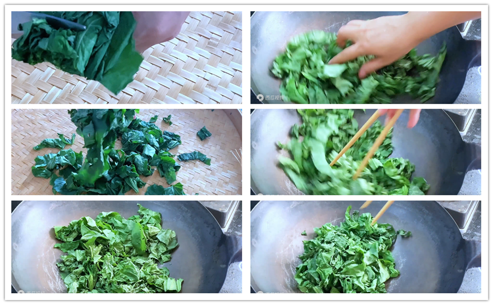 接着准备一个簸箕,把清洗干净的丝瓜叶完整展开,平铺到簸箕上,一定不要叠着放,一张一个位置,然后放到阴凉通风的地方让它慢慢阴干,切记别放到太阳下面晒哦,因为现在是夏季,紫外线非常强大,在太阳底下直接暴晒,会让丝瓜叶中的营养物质快速流失,暴晒后绿叶素也容易氧化,那么茶叶看起来就会黄黄的,过高的温度还会让叶子有发酵变酸,凉晒的过程中记得翻面,给它凉晒均匀。那怎么判断晾晒好了呢?教大家一个小技巧,用手拿起一张叶子轻轻揉搓,能感觉到叶子水分已经被晾干,并且非常柔软就可以了。