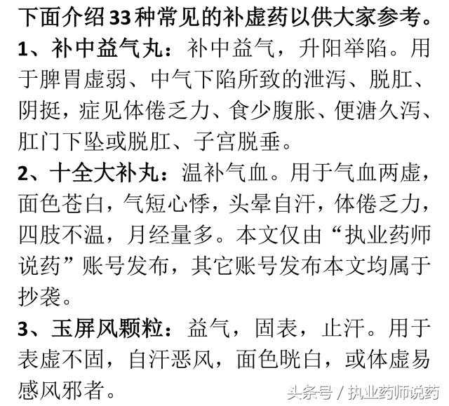 常用的补虚药有:人参、黄芪、白术、当归、熟地黄、白芍、鹿茸、杜仲、党参、北沙参、天冬、麦冬、冬虫夏草、杜仲、巴戟天、续断、肉苁蓉、山药、龙眼肉、蜂蜜、阿胶、何首乌、大枣、枸杞子、百合、桑葚等,相信大家对这些滋补的中药都非常熟悉,这里就不累赘了。