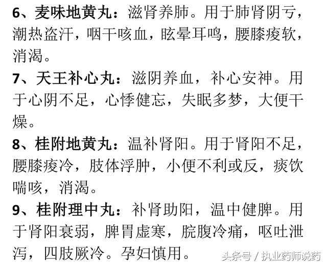 10、附子理中丸:温中健脾。用于脾胃虚寒,脘腹冷痛,呕吐泄泻,手足不温。孕妇慎用。