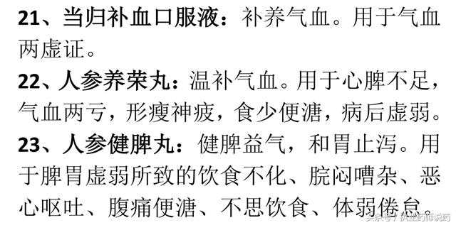 20、复方阿胶浆:补气养血。用于气血两虚,头晕目眩,心悸失眠,食欲不振及白细胞减少症和贫血。
