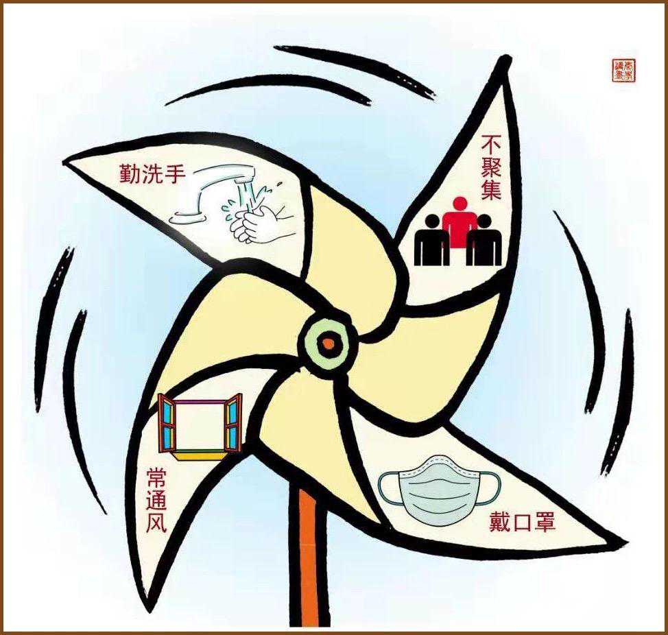 河北省美术家协会漫画艺委会及基层漫画作者也发挥漫画的特点,用漫画作品凝聚人心,鼓舞斗志,正确解读政策,科普医学知识,击破谣言等,为防控疫情贡献自己的力量。河北省美协漫画艺委会副主任张爱学用大大的中国结表达“众志成城战胜疫情”的祝愿和信心,用“健康风车”提醒大家戴口罩、常通风、勤洗手、不聚集;漫画作者嘎子陈创作一系列漫画提醒大家“非常时期,不信谣、不传谣”“非常时期,不哄抬物价”“非常时期,尽量不出门”;漫画作者张晓燕也用作品形象地告诉孩子,野味不能吃;漫画作者胡延亭用跨栏的形式为战胜疫情加油助力。