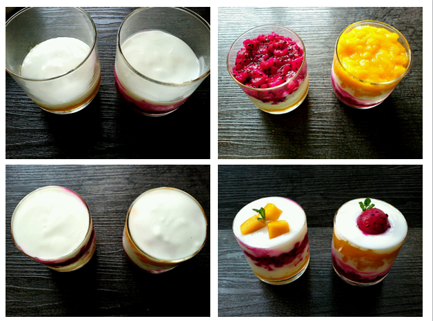 2.准备好两个玻璃杯,用勺子各舀一些果肉铺底层,再各舀入一层酸奶再各舀入一层果肉,底层是芒果的这次放火龙果,底层是火龙果的这次放芒果。