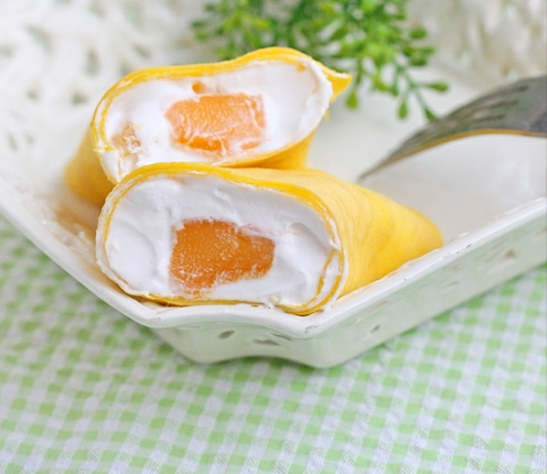 4.取一张饼皮加打发的淡奶油,放入一条芒果肉,再加一些奶油然后像叠被子一样,用饼皮将奶油包成长方体,切开。(里面也可以放其他水果)