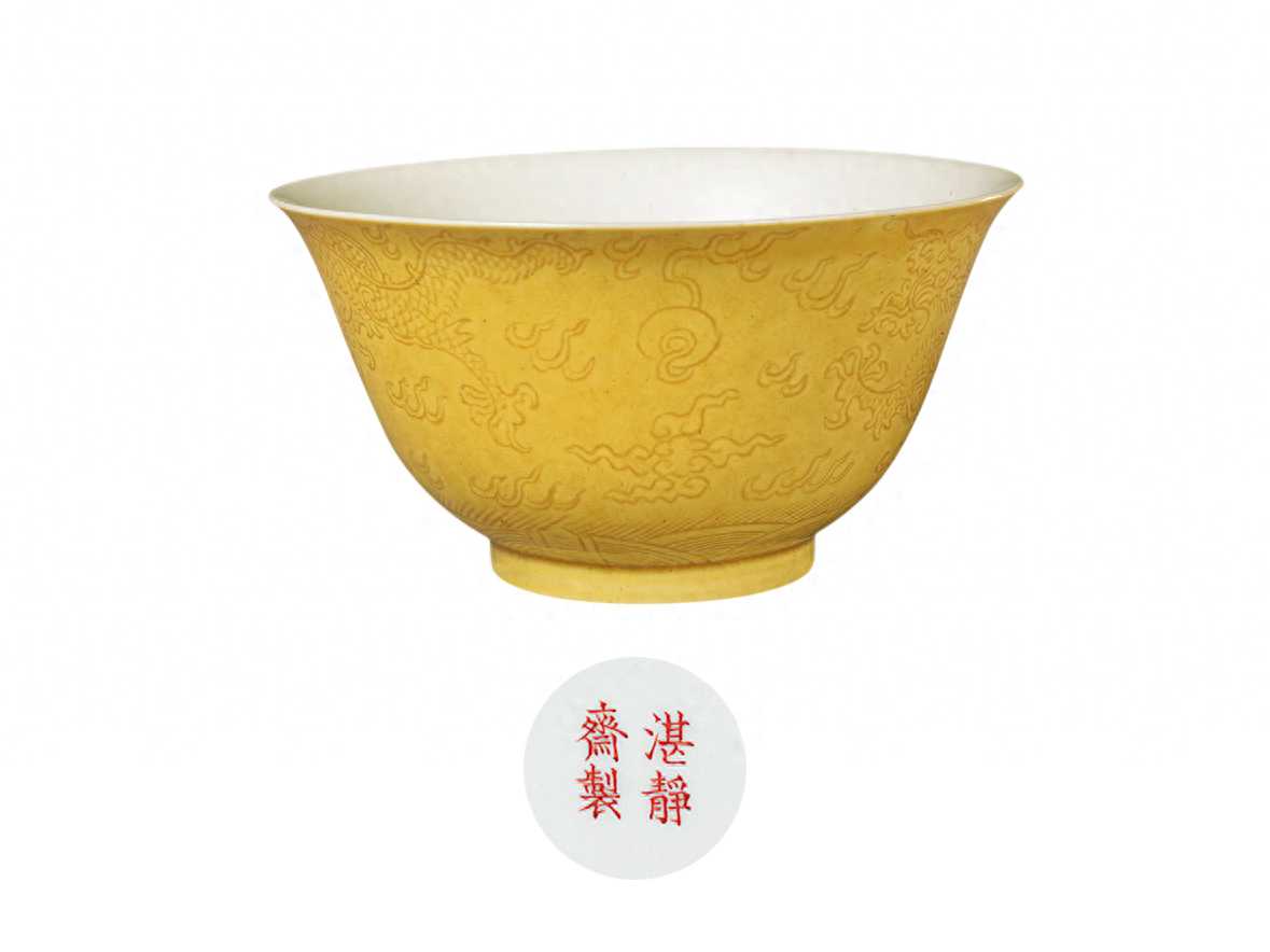 “湛静斋制”款瓷器,其品种主要为黄釉器,器形有渣斗、碗、小洗等。小洗的釉色浅淡,为柠檬黄。青花器有两件缠枝莲纹小粉盒。(清道光湛静斋制款外黄里白釉碗及款识故宫博物院藏为红彩四字款识本件瓷器里白外黄釉碗,做工极为精细,外腹部暗刻龙纹)