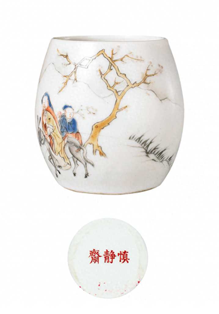 “慎静斋”款瓷器传世数量很少,目前仅见3件器物,其中两件为白地黑蝴蝶纹鸟食罐;另一件为踏雪寻梅人物故事图鸟食罐,均为宫中旧藏。(清道光慎静斋款粉彩人物故事鸟食罐及款识故宫博物院藏)