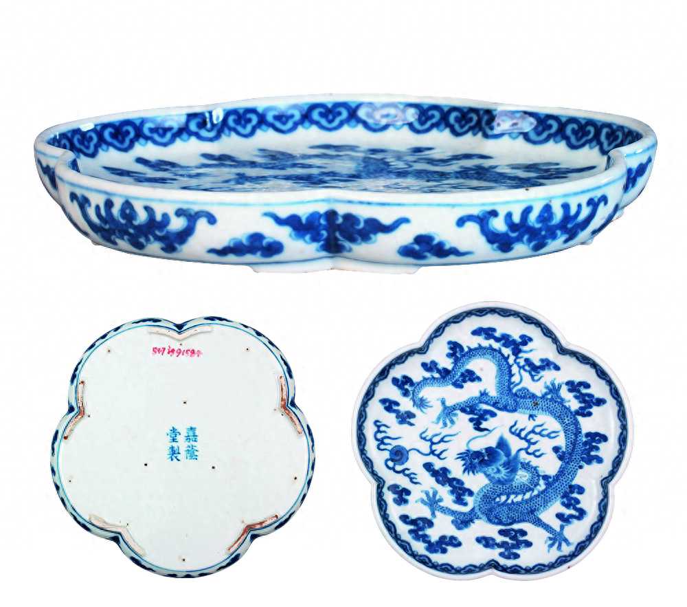 “嘉荫堂制”款瓷器数量也很少,仅见青花云龙纹浅碗,及花口碟各一件。这两件器物虽非清宫旧藏(由对外文化联络局调拨而来),但纹饰中龙的画法,与道光本朝年款的龙纹完全相同,且在故宫藏品中还有嘉庆时期署“嘉荫堂制”的旧藏品,说明嘉荫堂自建成后,清廷一直专为此堂烧造瓷器,所以这两件也应属道光皇帝御用。(清道光嘉荫堂制款青花云龙浅碗及款识故宫博物院藏)