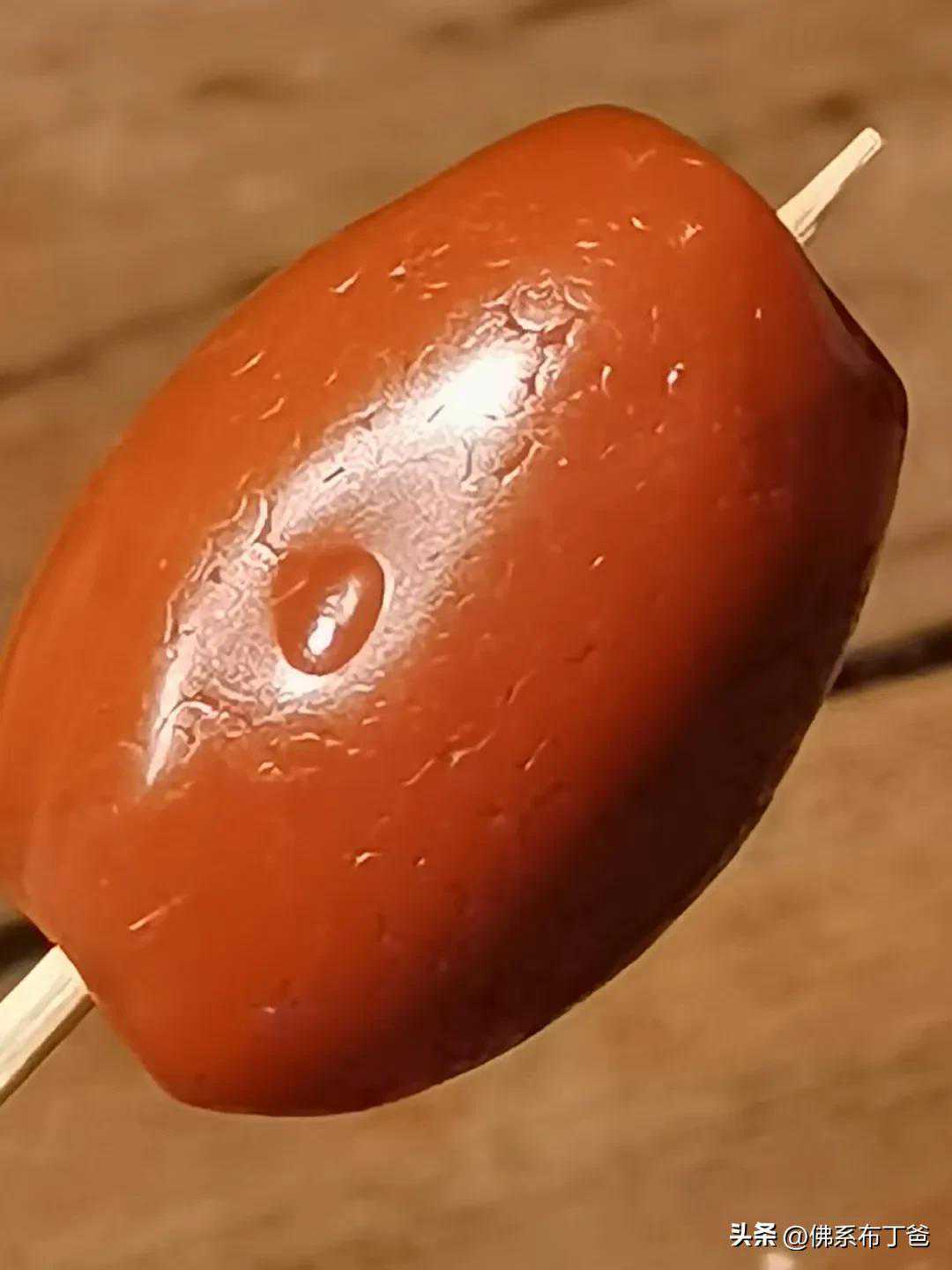 三)孔道,老南红玛瑙的孔道经过长期佩戴磨损,孔道光亮如镜,两端也有包浆一致的自然细腻光洁的磨损,这种磨损是仿不出来的。