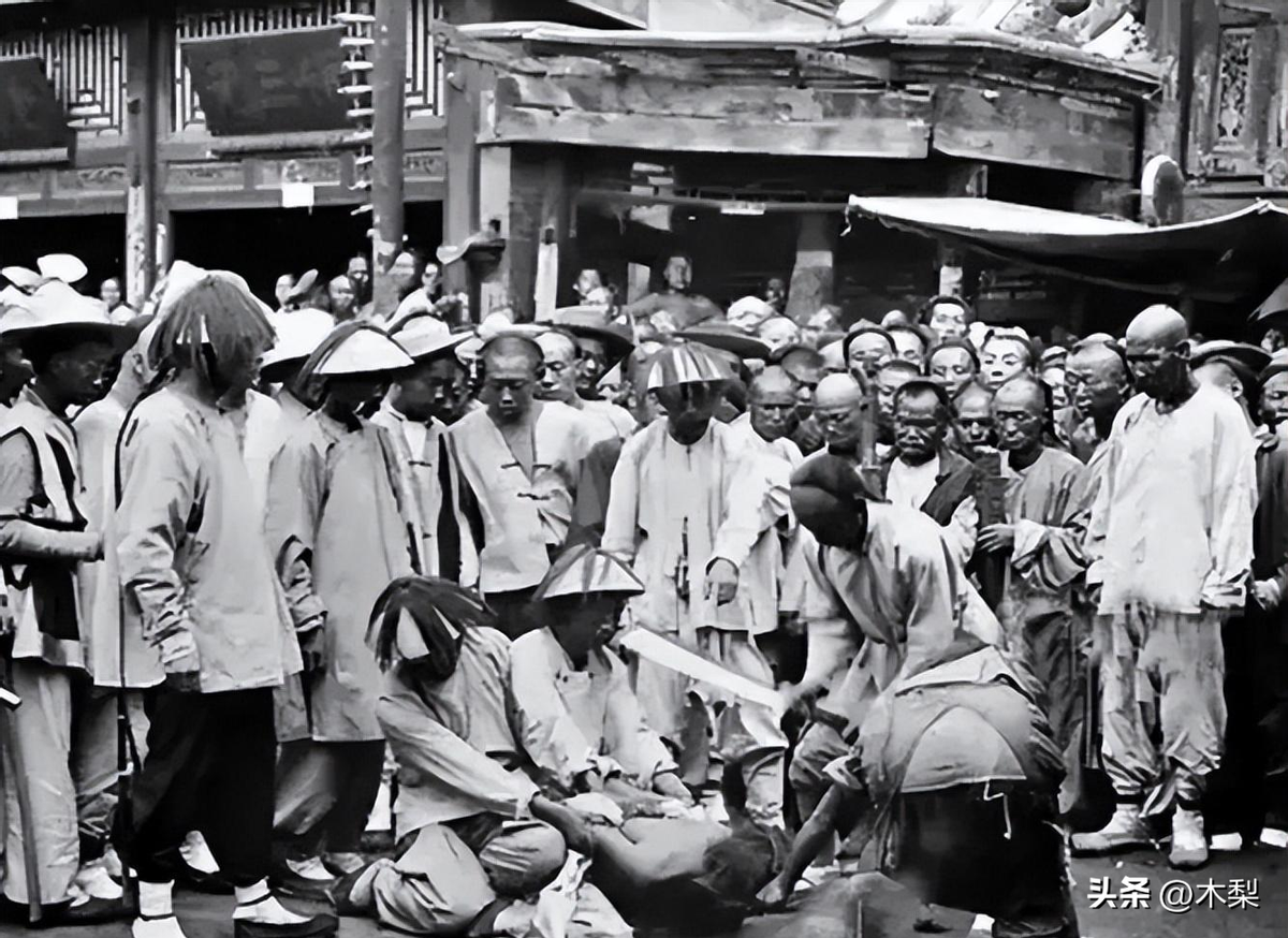 犯人被行刑的真实场景,两个清兵将其摁在地上,露出脖子。