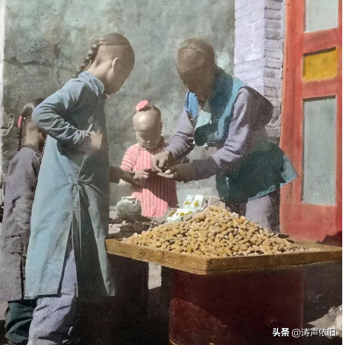 ,一个大男孩带着弟弟来购买,摊位上摆着的有点像现在的江米条。