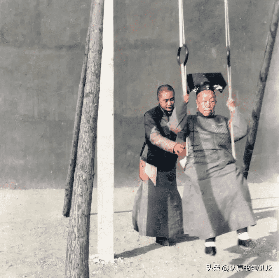 一个小太监正在服侍一名妃嫔荡秋千,