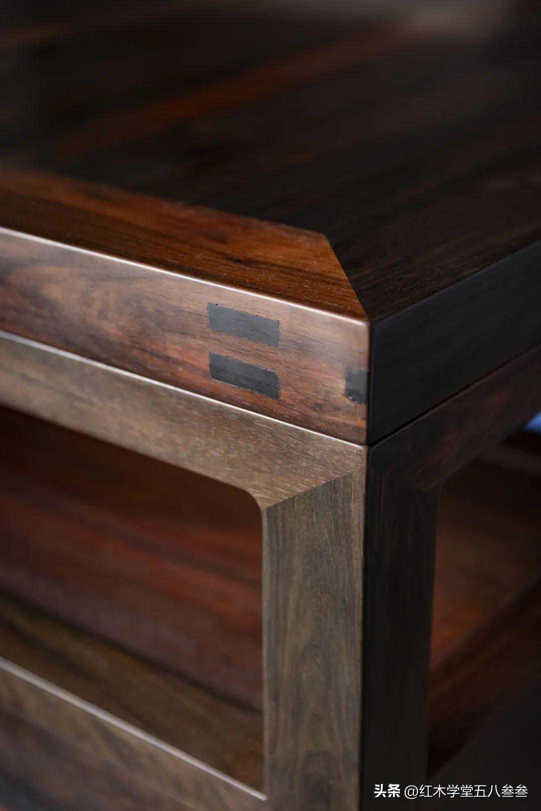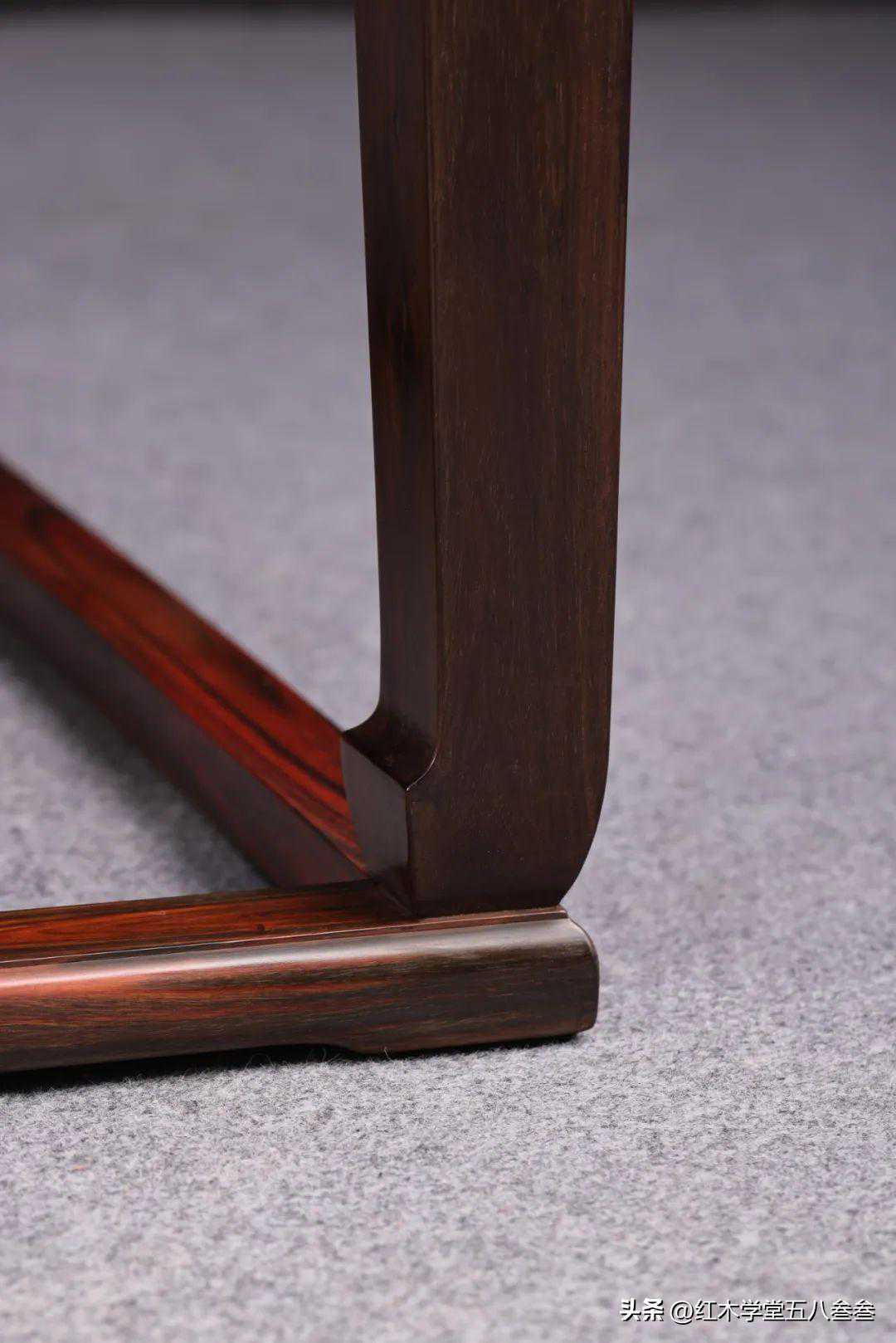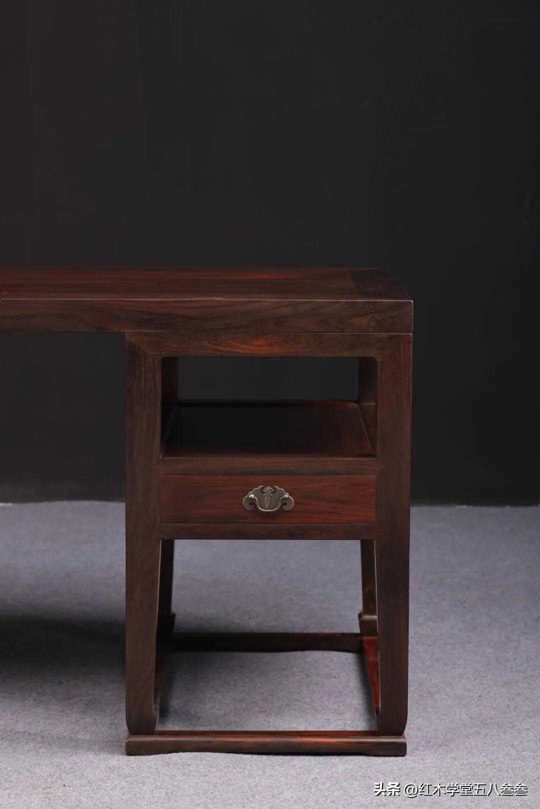 此张架几式书案,器形参考的是《明式家具研究》一书中的架几案式书案,但又非一比一复刻,考虑到作为书房书桌使用,此大红酸枝架几式书案,较原物加宽了桌面板,相应的底几也由原物的方几变为长方几底座,整器满彻大红酸枝老料。