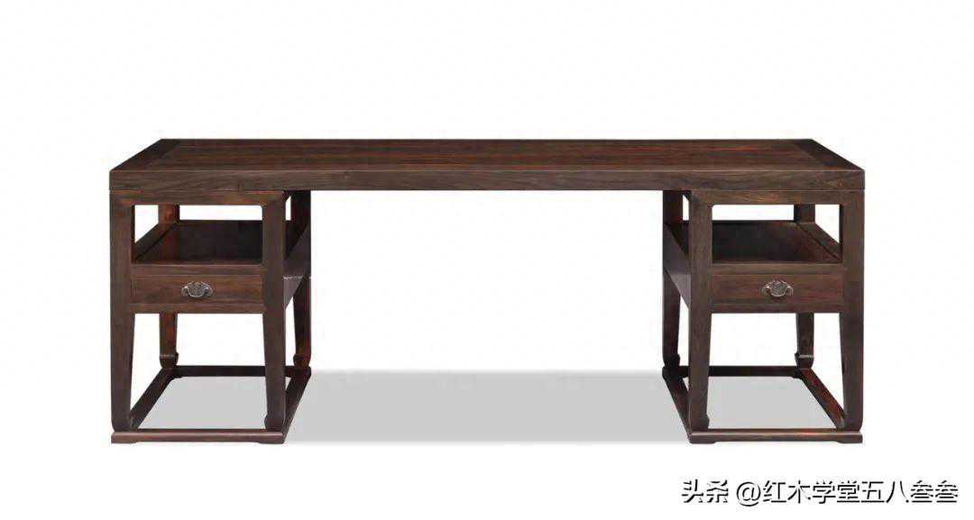 全器为方材,足端造出矮扁内翻马蹄,落在托泥上,造法与长方香几有相似处。几子在中腰设扁抽屉一具,上下空当任其开敞,不加圈口。案面边抹攒框装一块超群绝伦的巨大独板板心,搭搁几上,宽度与几子相等,故又称“搭板书案”。