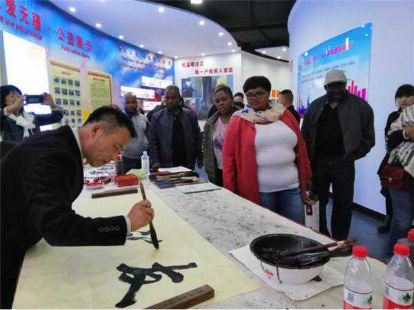 10月25日,非洲人国民大会全国执委研修班一行31人到行唐参观考察,在行唐残疾人双创园,中国书法家王新民义务做客行唐残疾人双创园,一笔一画地教园区入驻人员学写书法,并现场为中外友人挥毫泼墨,“友谊长青",“厚德载物",大红的“福“字,一幅幅作品苍劲有力,展示汉字之美,书法之美和中国文化之美。