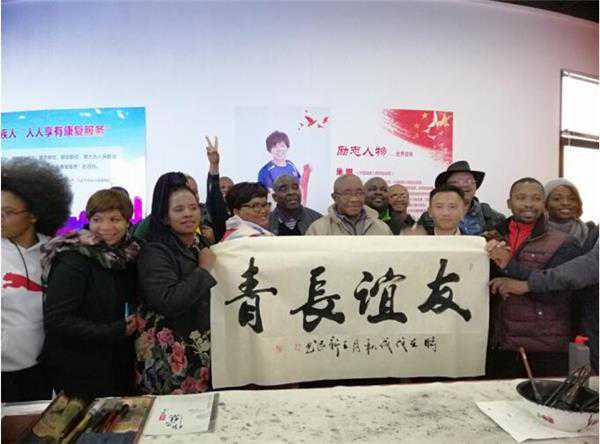非州友人考察行唐残疾人双创园提字赠送"友谊长青"