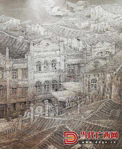 何二民认为,北海老街、老屋具有一种静态美,它们汇聚了先辈们的创造智慧,是东西方文化碰撞的结晶。他试图通过“老街系列”“老屋系列”的沧桑史,来唤起人们对古老历史的回忆和保护文化的意识。他另外画的北海街头巷尾那些充满了生机和活力、盘根错节的古老榕树,让人们领略了千年榕树的苍劲之美。他的《生生不息》《榕树》《听涛》和《南珠魂》等作品,在黑灰白的转换中,既突出了古树枝叶“空灵”的潇洒风度,又呈现它宏伟苍茫的大气象。