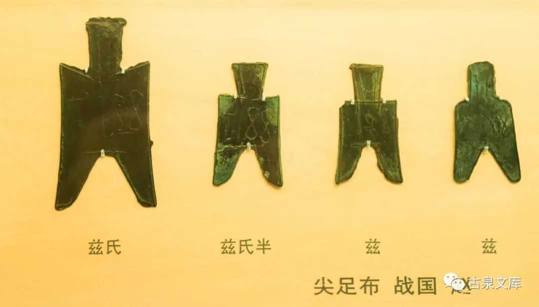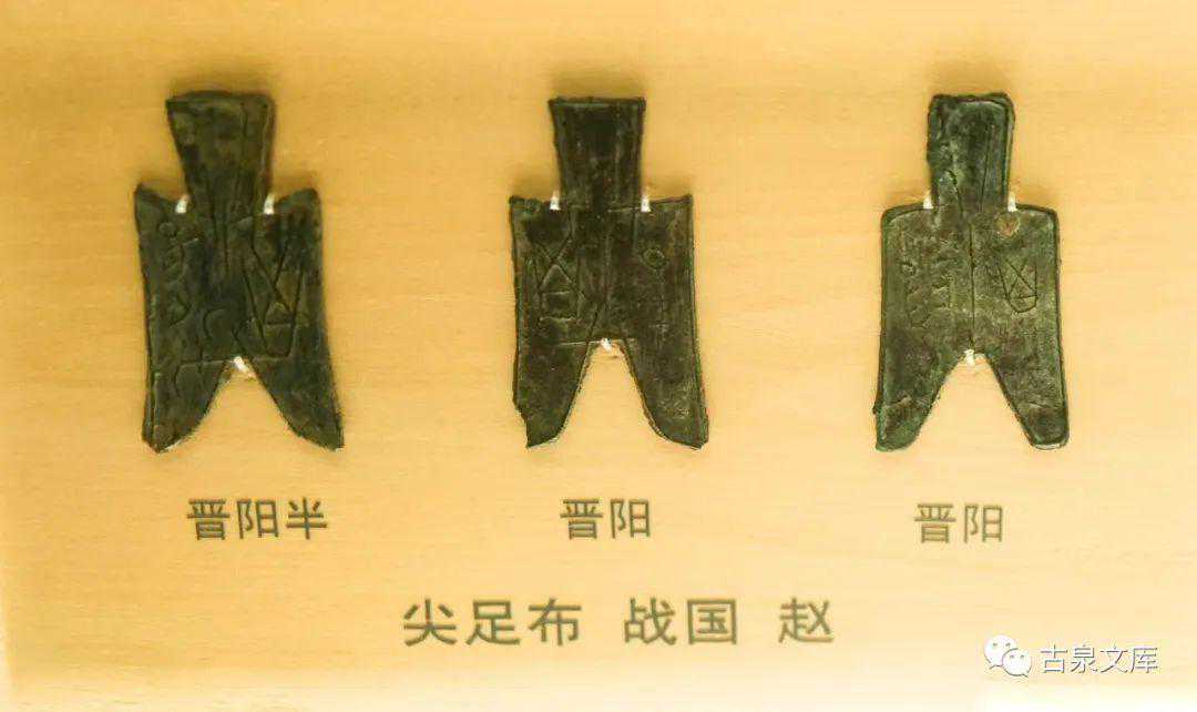 以下数图皆为赵国所铸尖足布系列。尖足布币文以地名为主,兼有"半"字标明币值,所示地名依次为:晋阳(今太原)、邪山(地望待考)、蔺、兹氏、离石(小型尖足布为名珍)、武安、武平、北兹、西都、甘丹(即邯郸)、大阴: