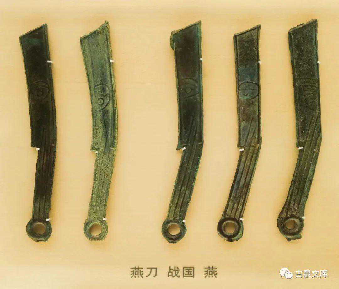 下图上博定义为草原系尖首刀,实则上排及下排左1左2应为燕系尖首刀二式,至此产生于戎狄部落的刀形货币渗透至燕地;下排右1为燕系尖首刀三式,也称"类明刀":