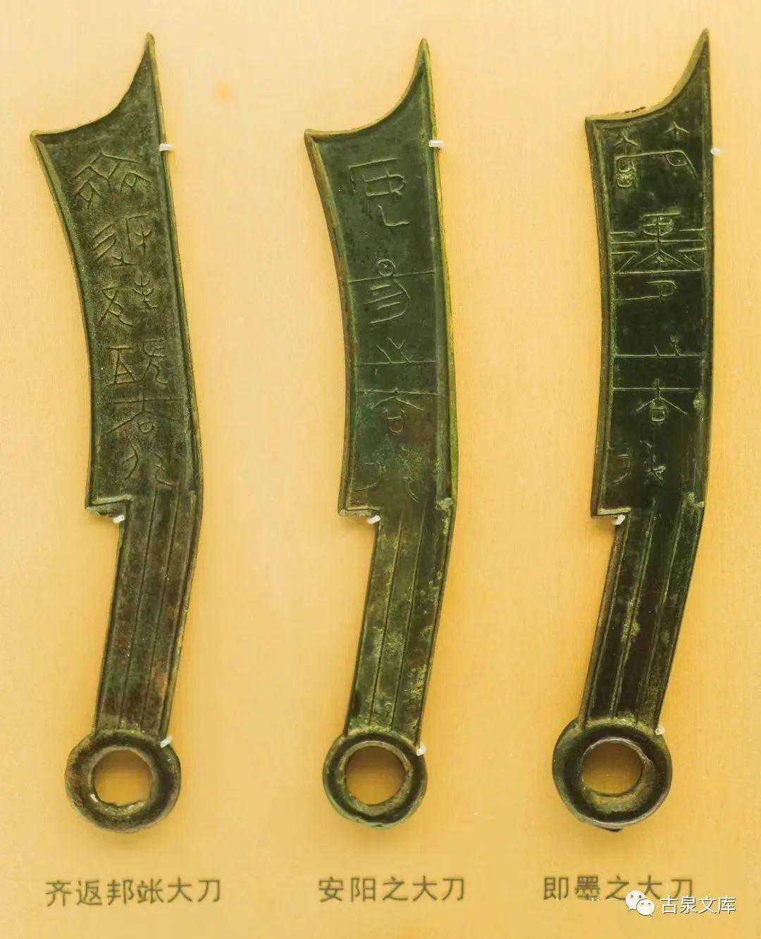 东方大国,先秦时期唯一能与强秦抗衡的齐国,最早行用的是大型刀币,齐国刀币精整大气,颇受藏家喜爱。下图左为大名誉品六字刀,右侧两把为五字刀: