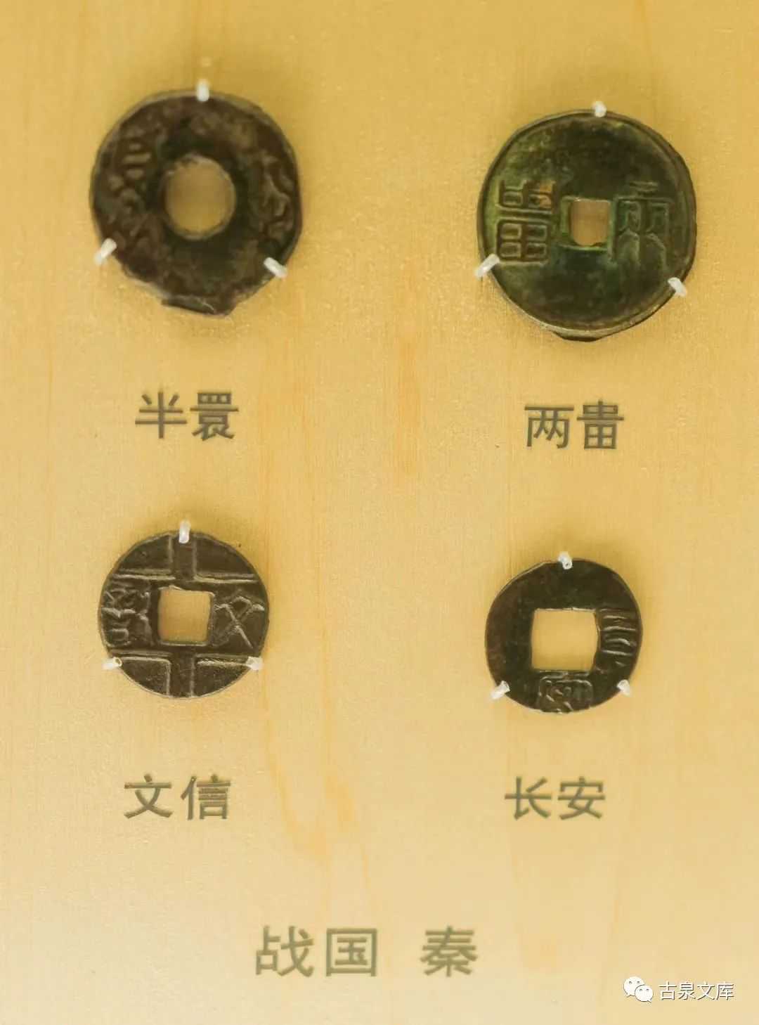 其他圆钱,其中上排左一"半圜"归属待定,吾意此类对读者当属魏,旋读者属秦。上排右侧为有廓两锱,虽为秦币然多见于"宛"(今河南南阳),其铸主归属另文深谈。下排左一为吕不韦所铸之"文信",右侧者"长安"为秦始皇之弟长安君成蟜所铸: