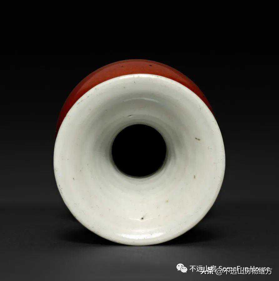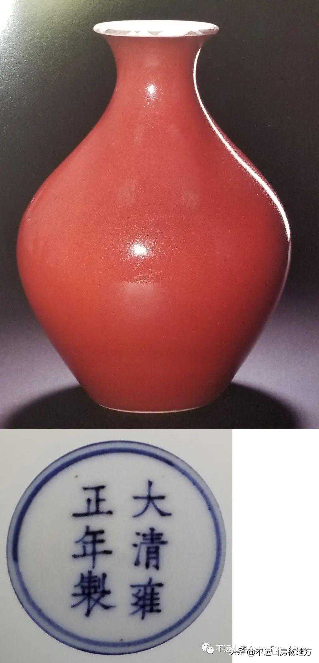 铁红釉,又称矾红、珊瑚红釉,是以氧化铁为呈色剂,在低温氧化气氛中烧成的一种微带橙黄的砖红色釉。雍正时的珊瑚红器釉层薄透而均匀,有明显桔皮纹色调沉着光润精美,呈现出富丽堂皇精致典雅的宫廷气象。珊瑚红釉是康熙时期创烧的低温彩釉,以铁为着色剂,因其釉色红中闪黄,色如红珊瑚而得名。此品颈部细长,器形秀美挺拔,如美人娉婷婀娜,全器满施珊瑚红釉,釉色细腻匀净,鲜艳纯美。《陶雅》谓之“华贵中之佚丽者也..匀净明艳,殆亡伦比。紫晶逊其鲜妍,玫瑰无其娇丽。”胭脂红虽然在康熙中早期就传入景德镇御窑厂,但是由于科技含量较高、造价较昂贵,直到康熙末期也没有被御厂普及使用。雍正中后期,由于御窑厂制瓷的发展革新,胭脂红逐渐推广使用至众多彩瓷领域。