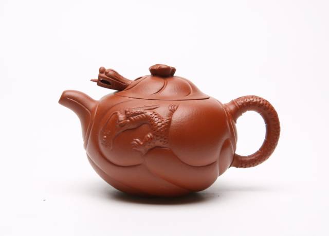 为典型传统壶型,是鱼跃龙门之意.民国的唐树芷所制小鱼化龙壶钮为卷云状,壶身浅塑波浪,波浪中龙伸出首部,龙尾卷成壶把,把上鳞片刻划清晰.此壶红泥制成,形体较小,做工精细.清代邵大享鱼化龙为波浪堆塑得一层一层,立体感强,而波涛中龙露出头部而不见爪,钮为堆浪状,装在盖里的龙头短而粗。