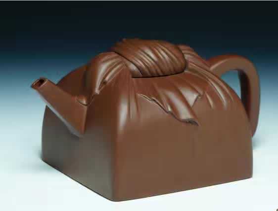 印包壶之制始于时大彬,据载徐友泉、陈鸣远亦擅此式。传世印包壶近代为多,形制或正方或长方。大凡明末清初考,造型丰满,折纹自然。细看印包方壶,虽用陶土制作,却有布包扎的质感,褶裥规整匀净,卷曲自然,巧以布结作截盖,增添了几分飘动灵巧的美感,也充分体现了紫砂的材质,便于制作多种造型的茗壶,达到题材所需的表现力。