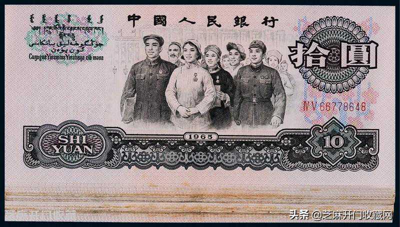 2:第三版人民币1965年拾圆,补号券、错版券·正背面图案均大幅向上移位,十分罕见,成交价格:RMB6325