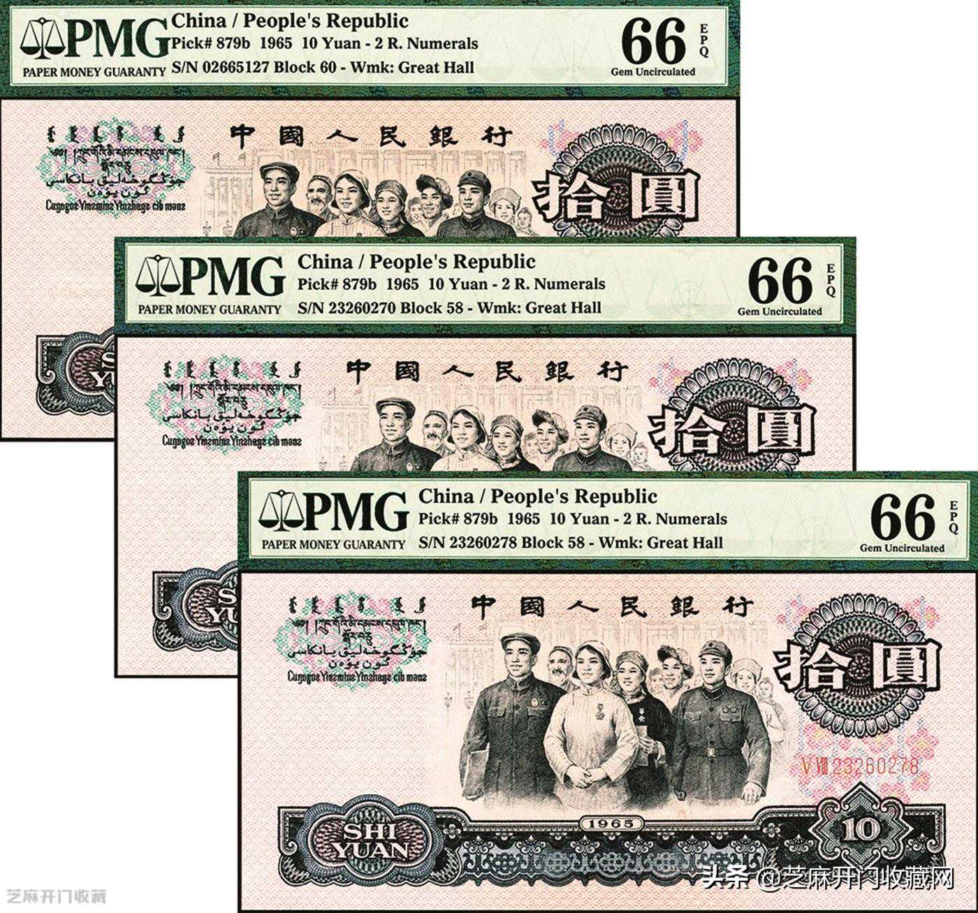 4:1965年,第三版人民币拾圆,大团结,一组共3张,PMG66EPQ。全程无4,估价:RMB100,成交价格:RMB1150