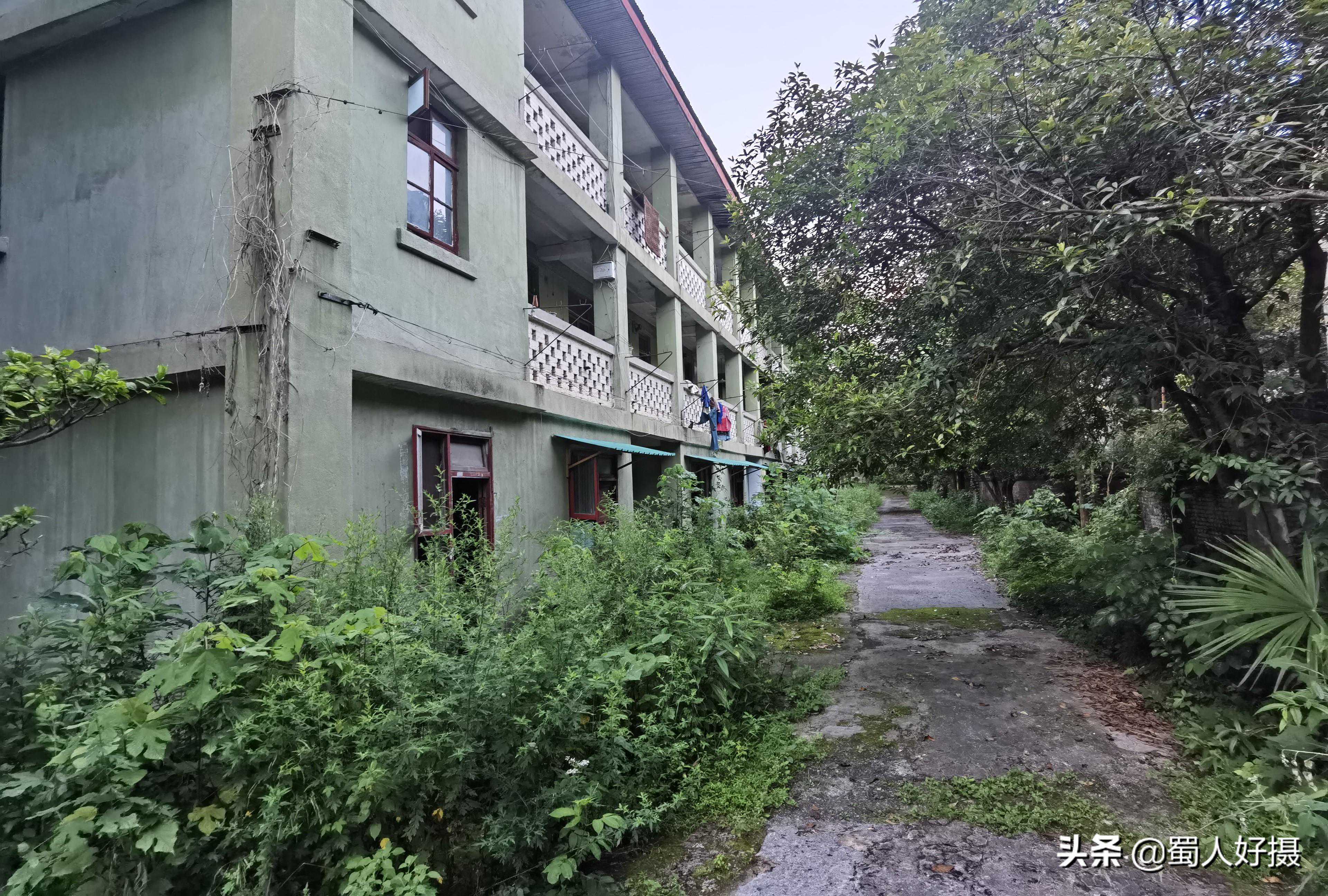 三座工厂的生活区职工宿舍,锦江厂的自然条件比另两座差些,因为找不到平地,房子都是顺山势而建,全部由红砖垒砌。据观察,锦江厂的生活区现在是基本无人居住的状况,宿舍楼已现颓势,许多都被野草藤蔓遮掩,也许再过一二十年,这片红砖房屋就会消逝在山林荒草之中了。