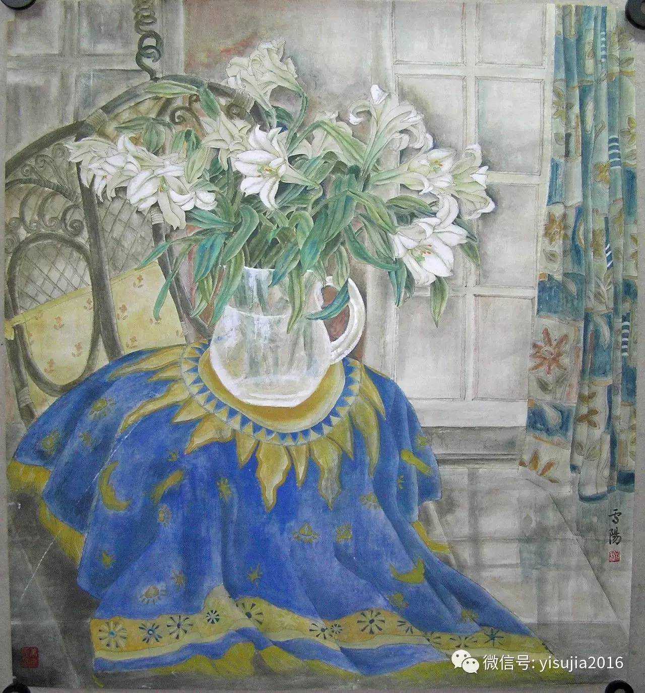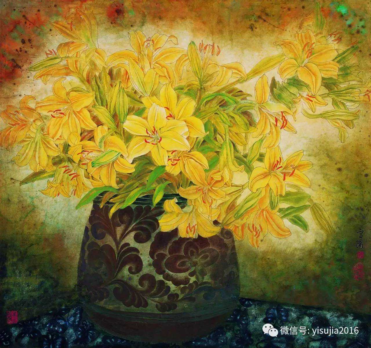 “为了歌唱,玉兰花/洁白的心向蓝天打开/为了不再孤独,繁星似的迎春到处闪烁/金色的声音刺激着我们/阳光追逐着,鸟儿牵动着/让我们一块儿走吧/在花瓣匆匆铺就的道路上芬芳地走吧。”如果把江河的朦胧诗进行可视的图像化表达,那么庄雪阳的画作无疑是个契合的选择。灿金的百合、淡雅的兰、洁白的梅,她所描绘的世界,永远不张扬不躁动,仿佛有精灵脚步翩跹地流连。空幻隽永间,滤透出年华的记忆。
