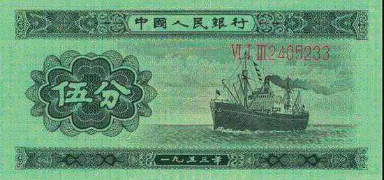 票幅100×47.5毫米。正面右侧主图为轮船,左侧面额“伍分”。正背均为墨绿色,胶版;正背面与“壹分”“贰分”券相比除面额、主图不同和符饰有差异外,其他基本类同。无水印。暗记:正面轮船后部有似“P、H”字样。