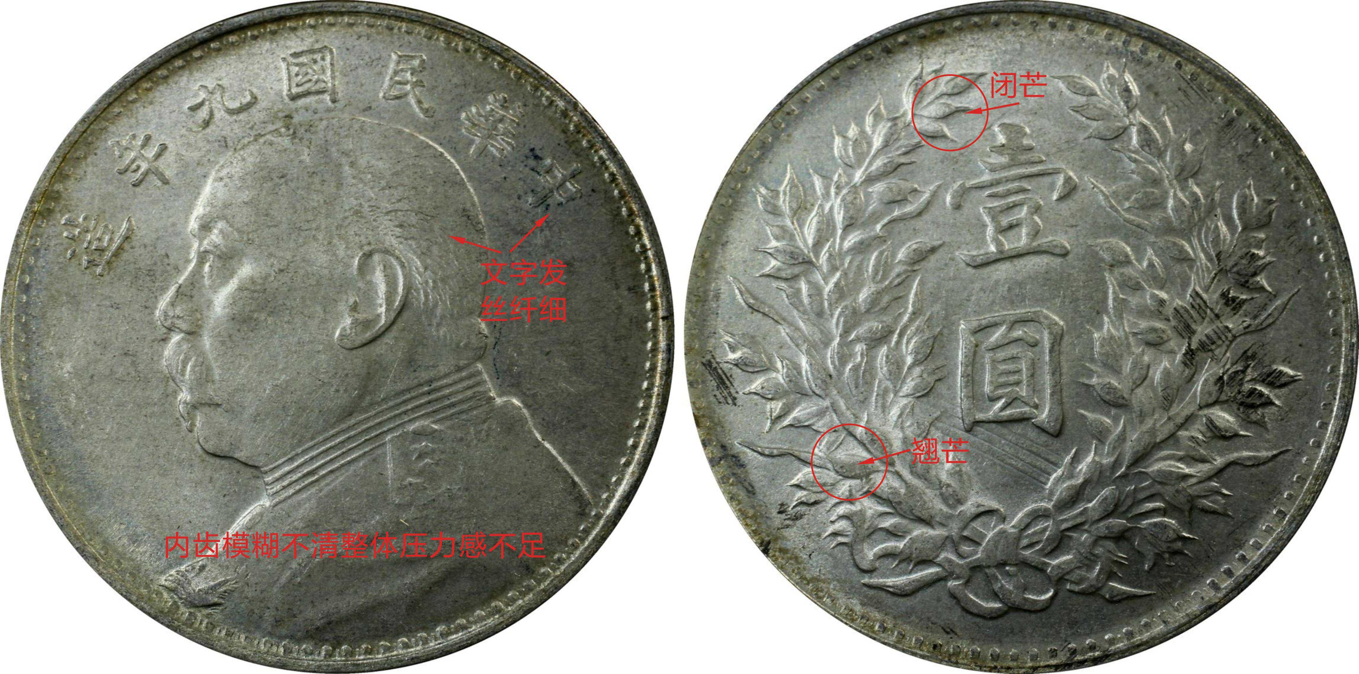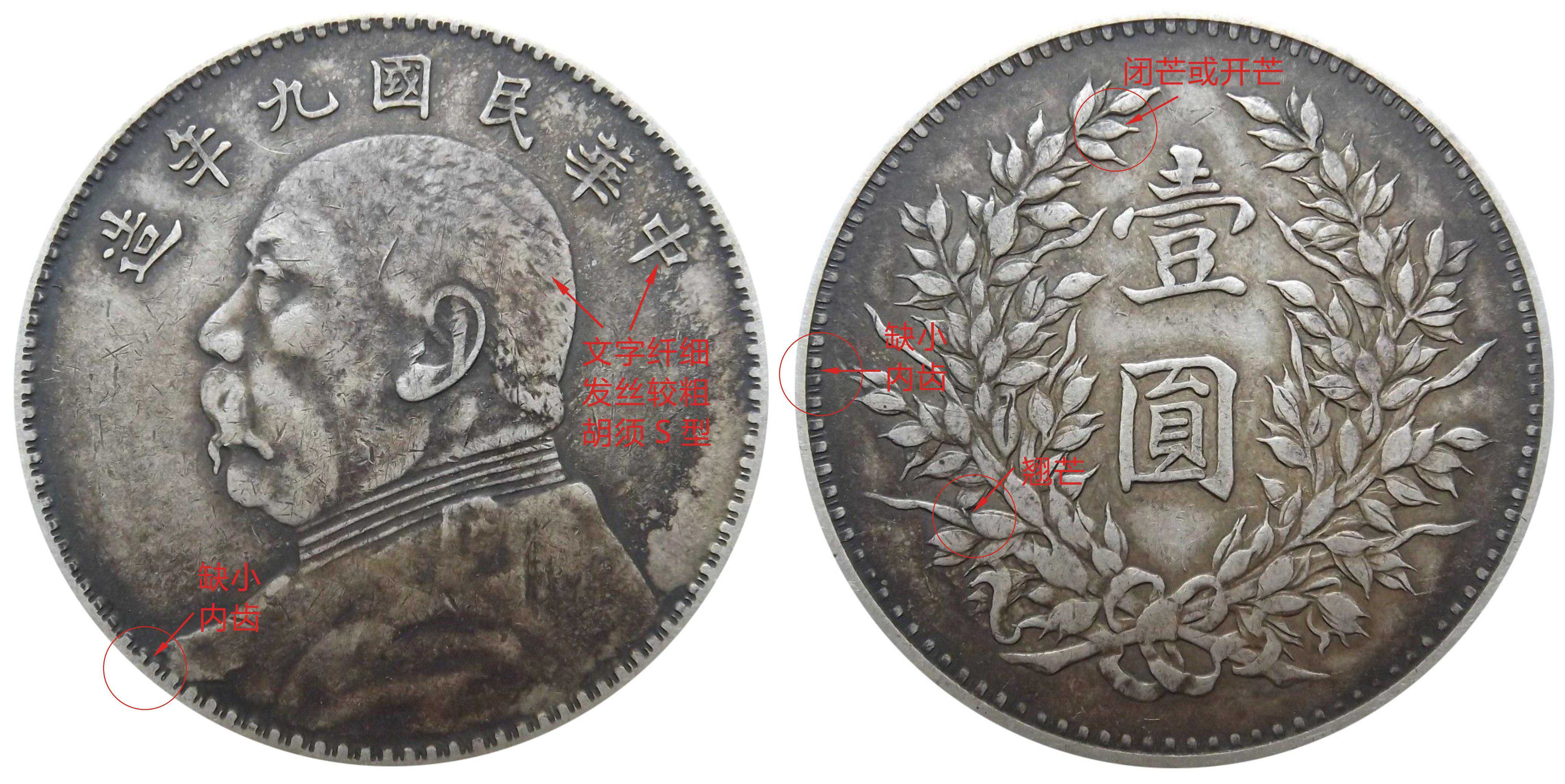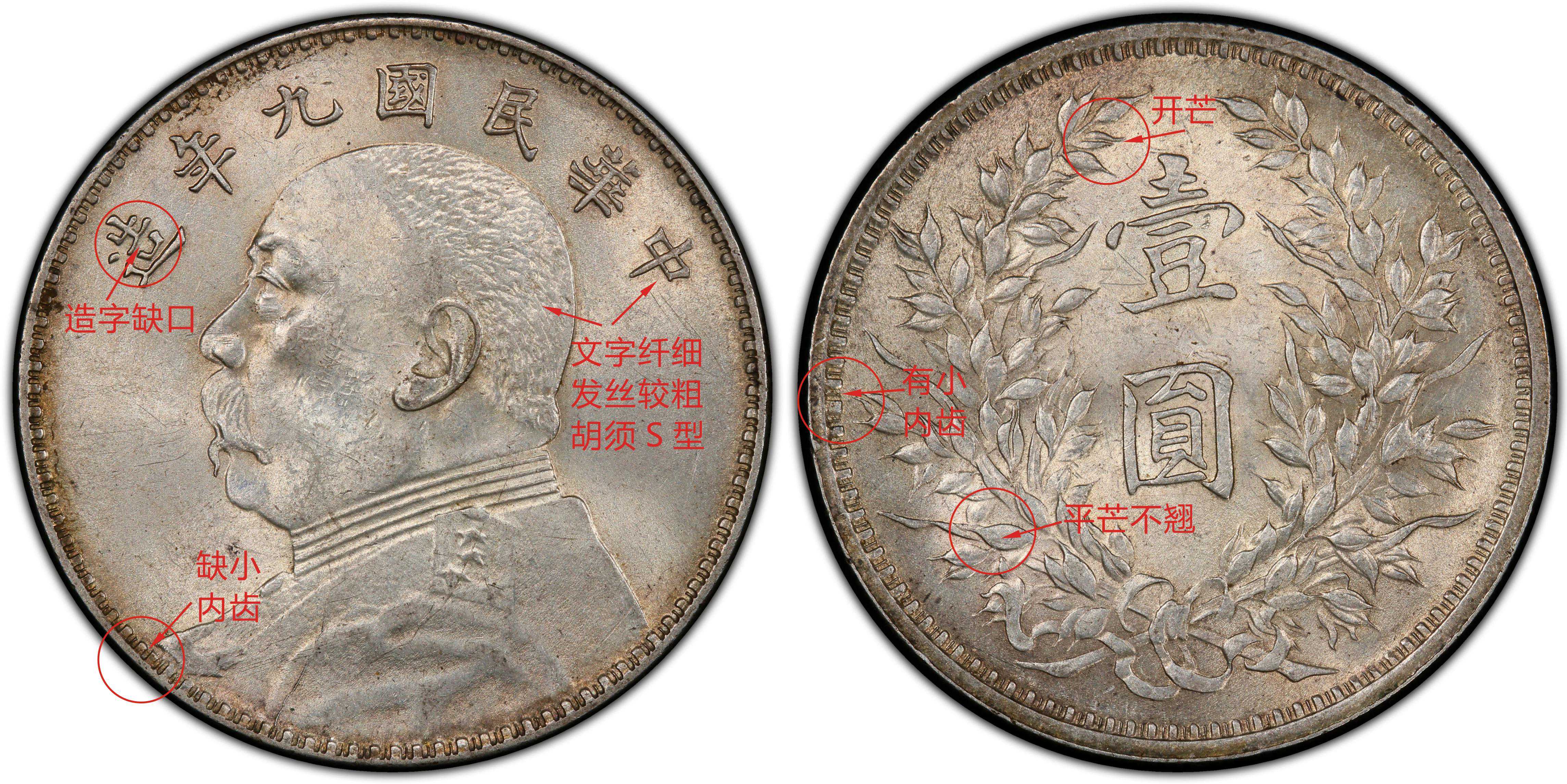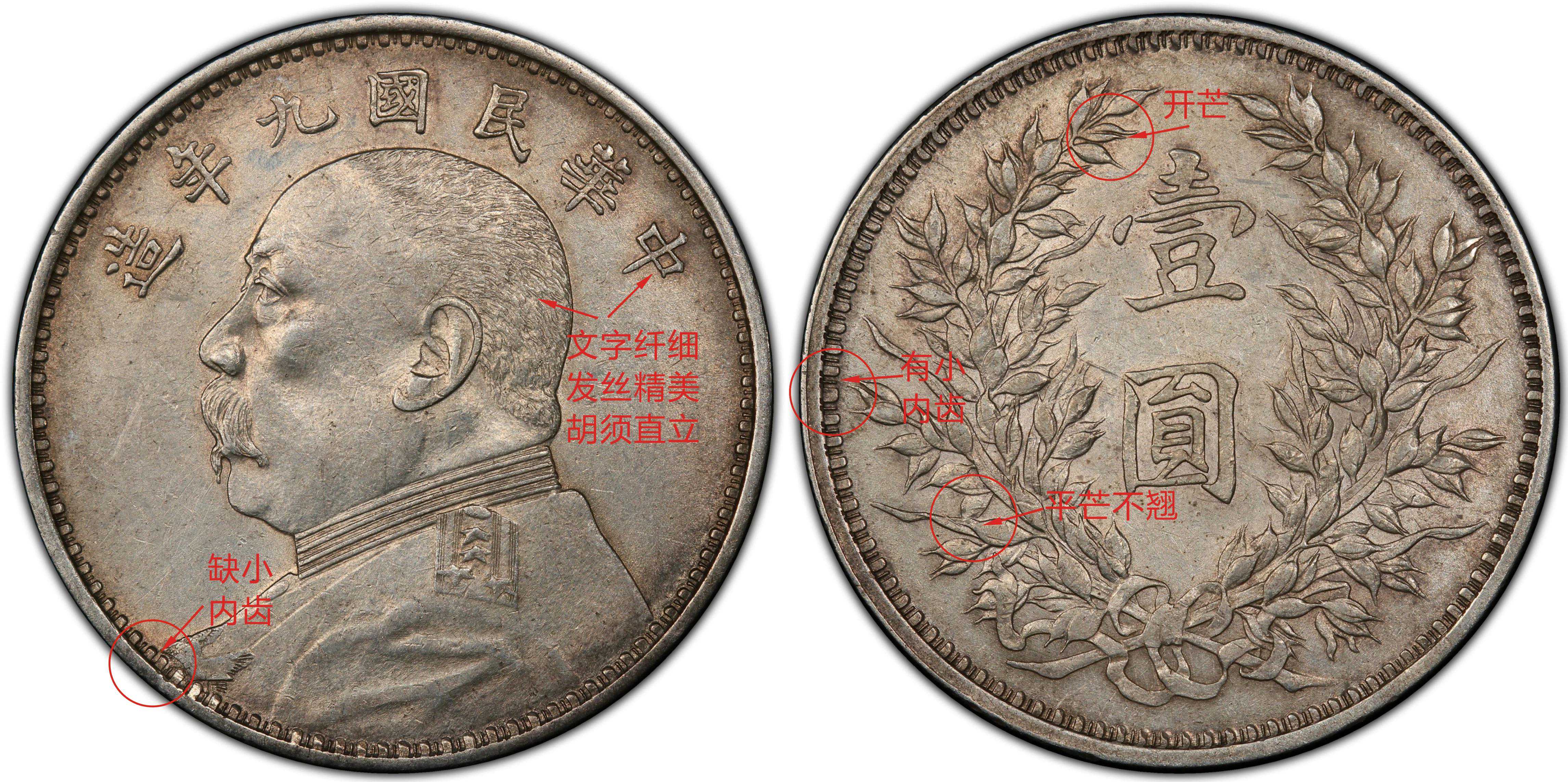 九年精发小嘉禾版别又称之为“九精”,整个币面均为精雕细琢,人物图案立体感极强,尤其是人像的头发和胡须精细到位,深受藏友喜爱。其特徵为正面人像胸前缺一小内齿,字体纤细、发丝精美;背面图案为小嘉禾,左侧九点钟方向缺一小内齿,左上方第二颗穗粒为闭芒,左下方穗粒为翘芒。
