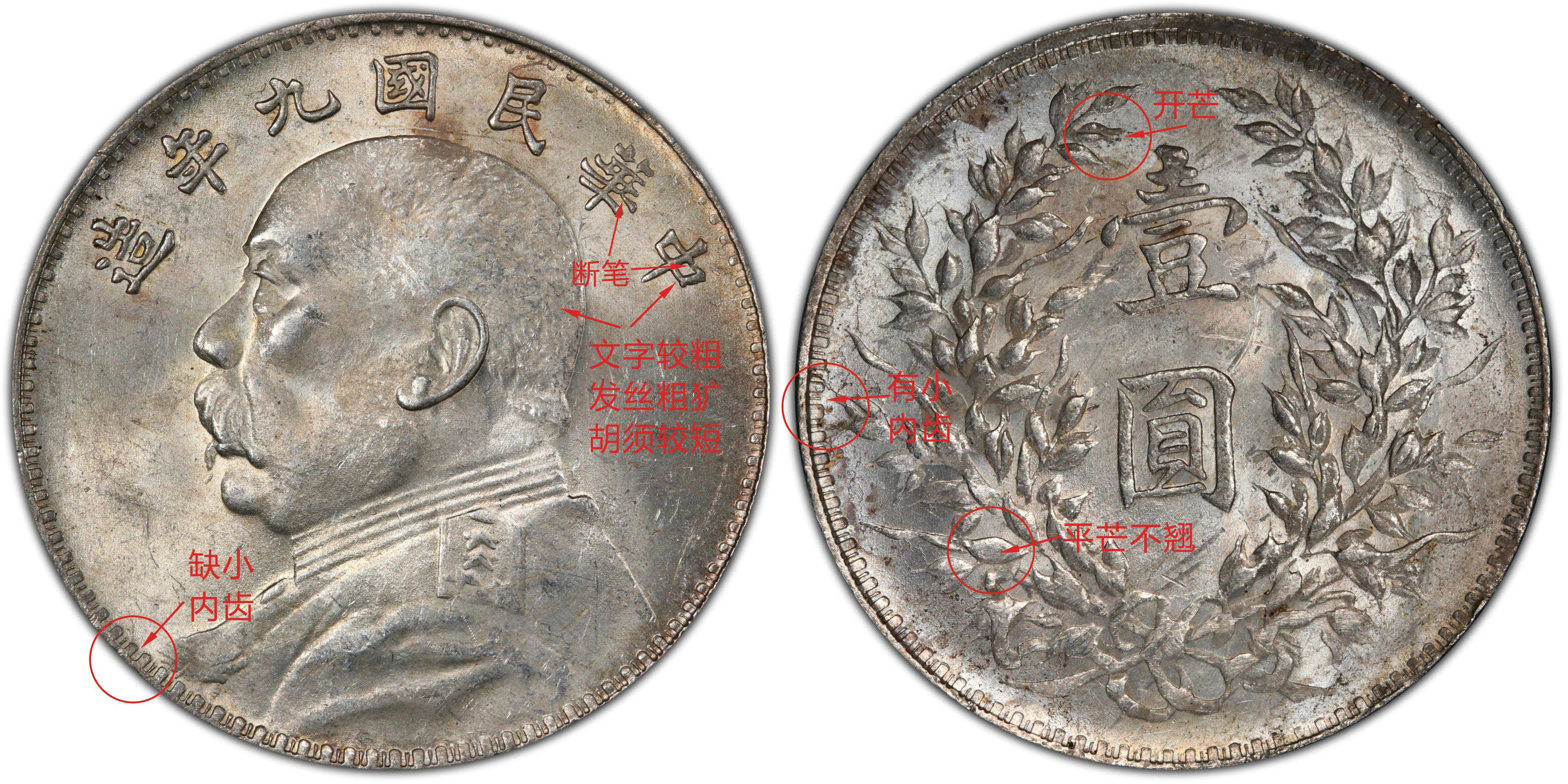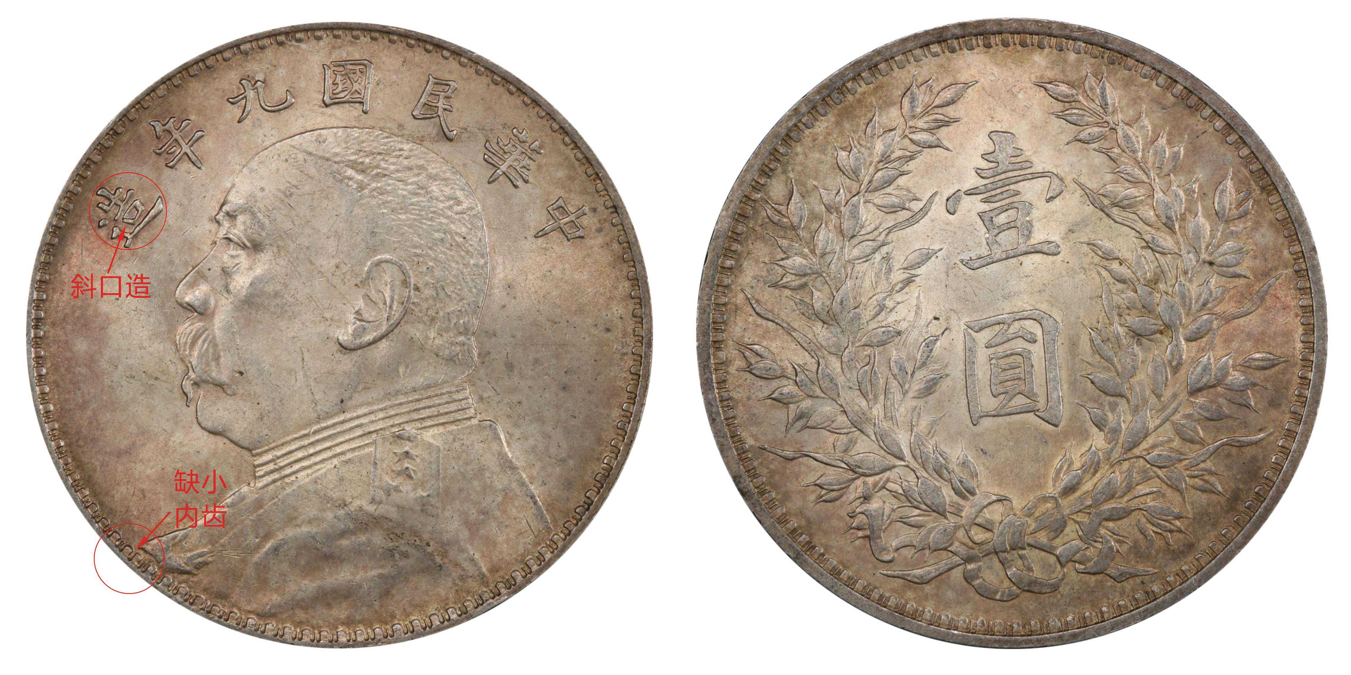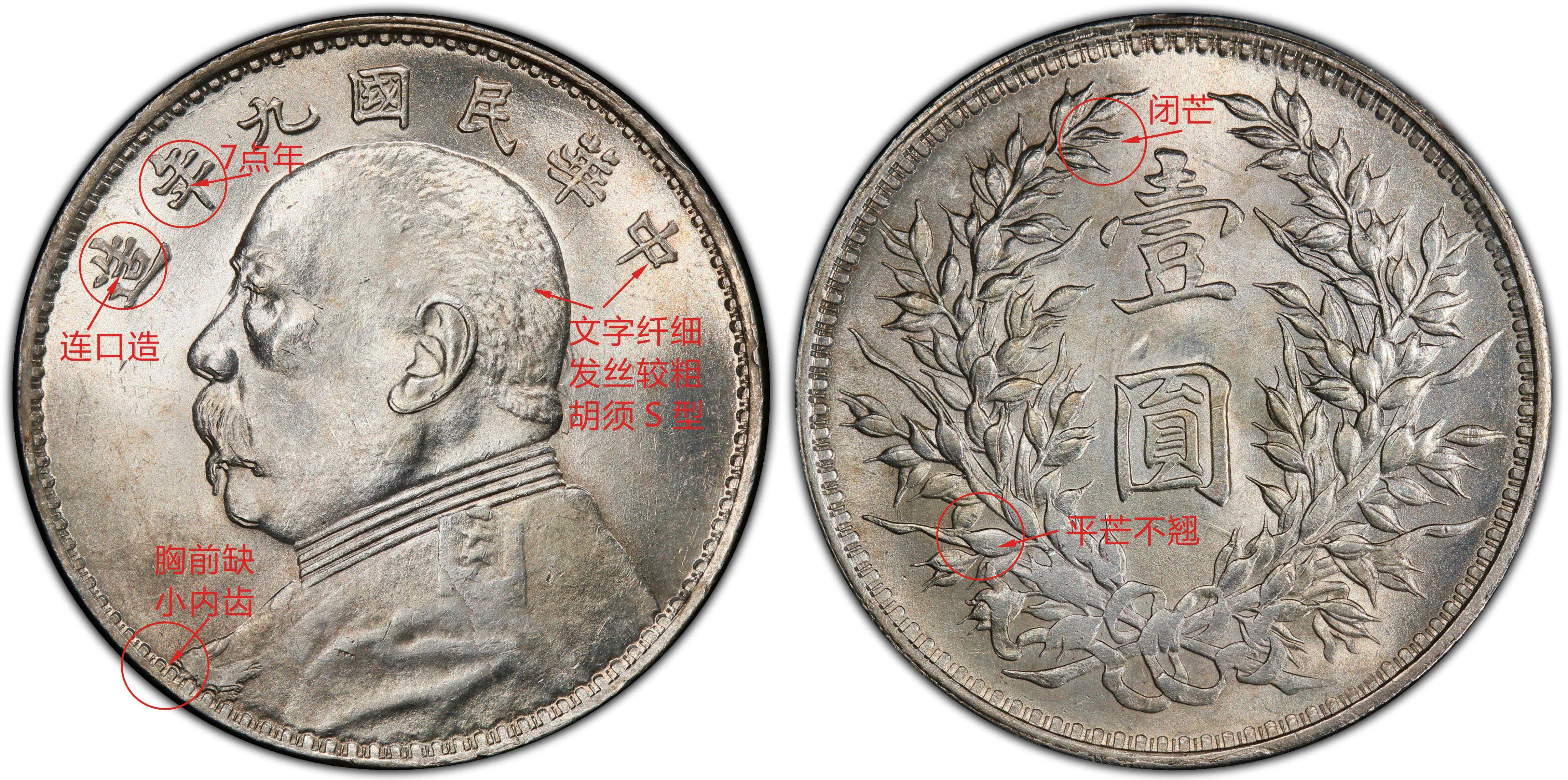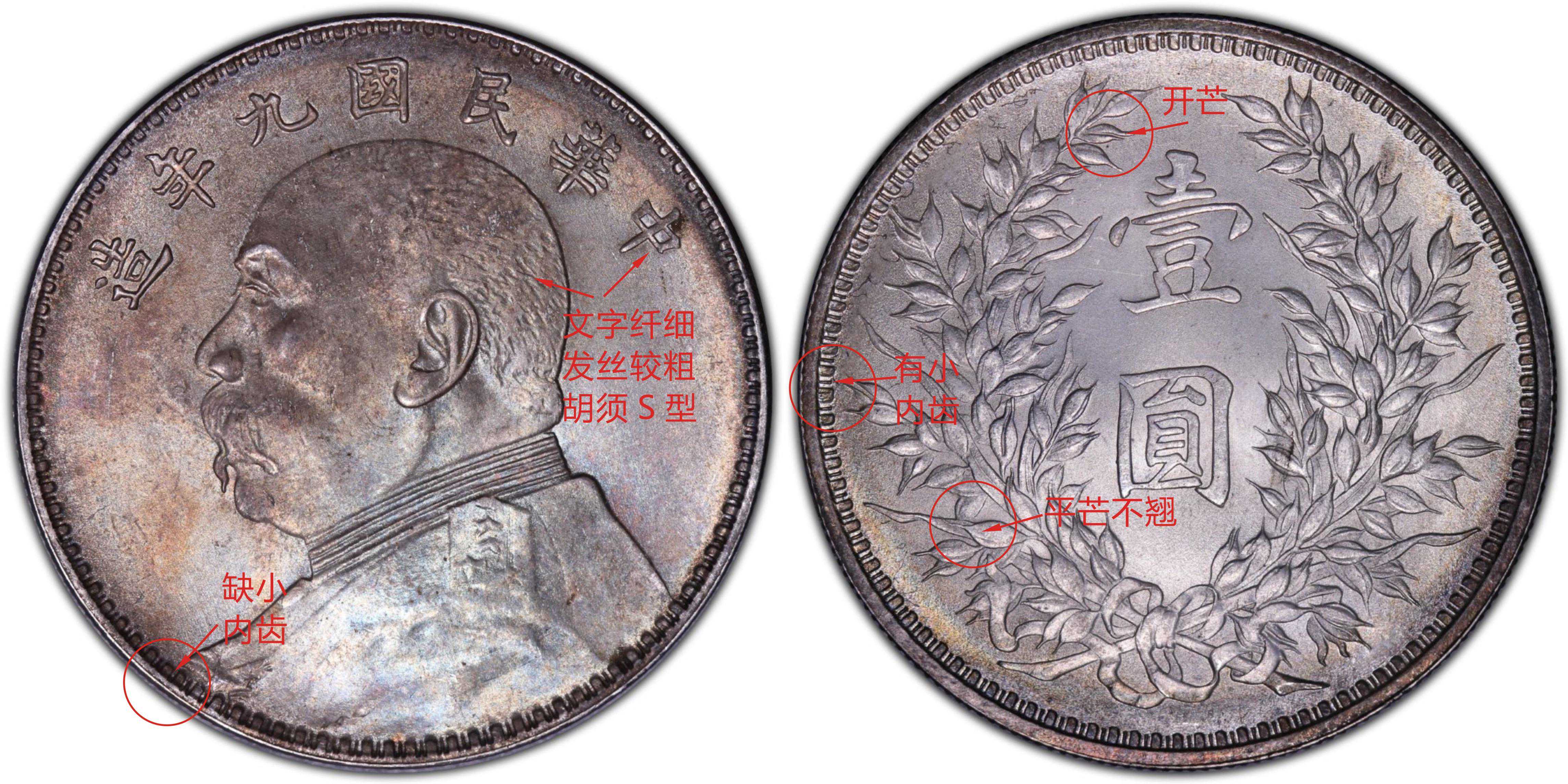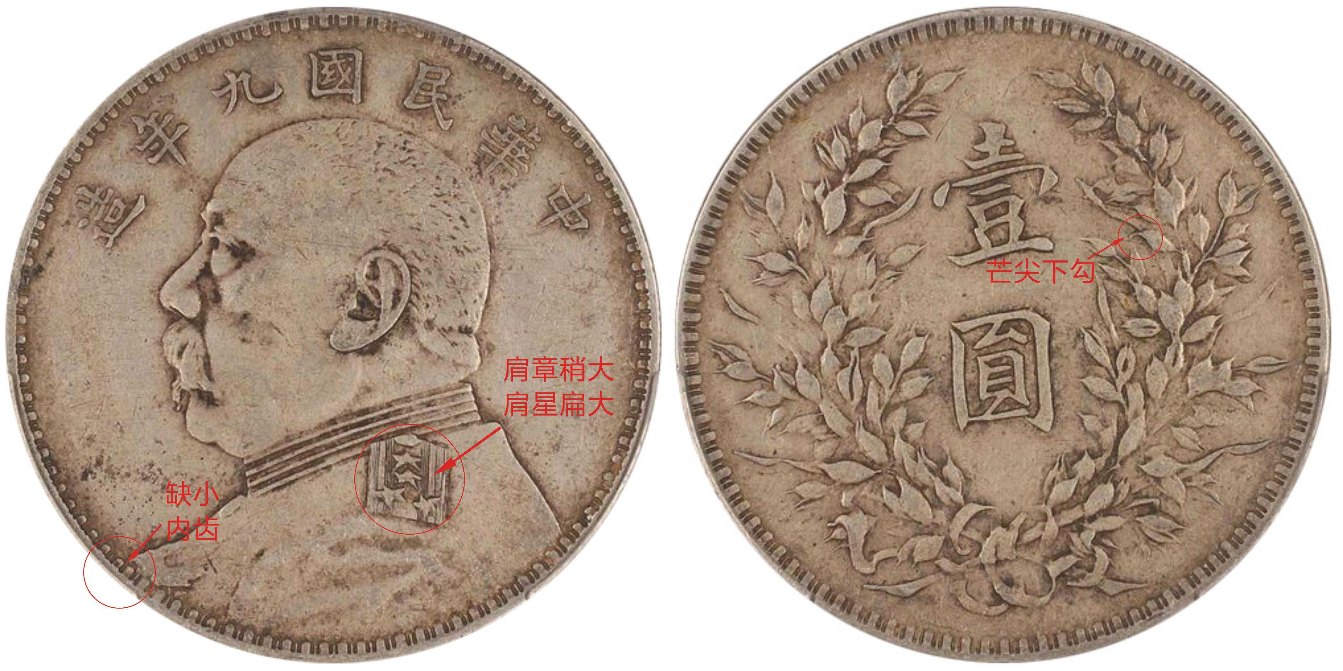 九年大肩章版别比较稀少,好品难得一见。主要特徵为正面人像的肩章比普通的稍大,肩星大而扁;背面嘉禾具有十年嘉禾特征,右边麦穗尾是下弯钩芒状。