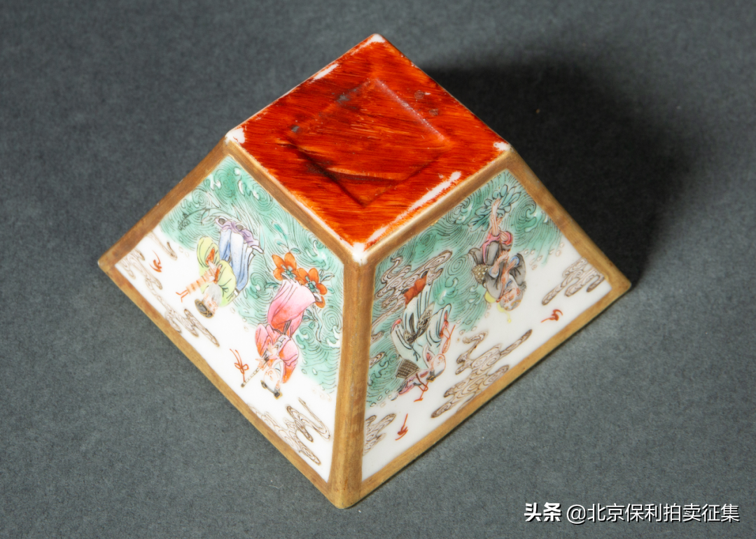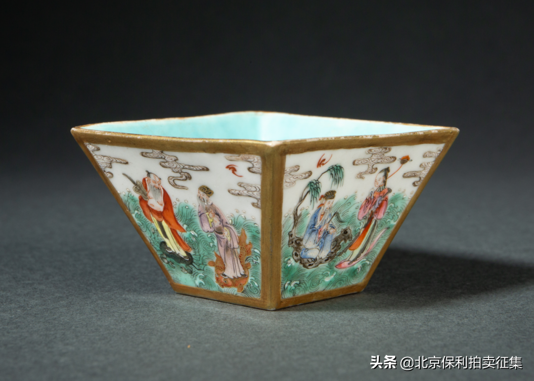 清乾隆木纹釉内松石绿描金粉彩八仙方斗杯