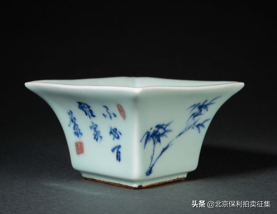 清乾隆青釉地青花釉里红花卉诗文四方斗杯