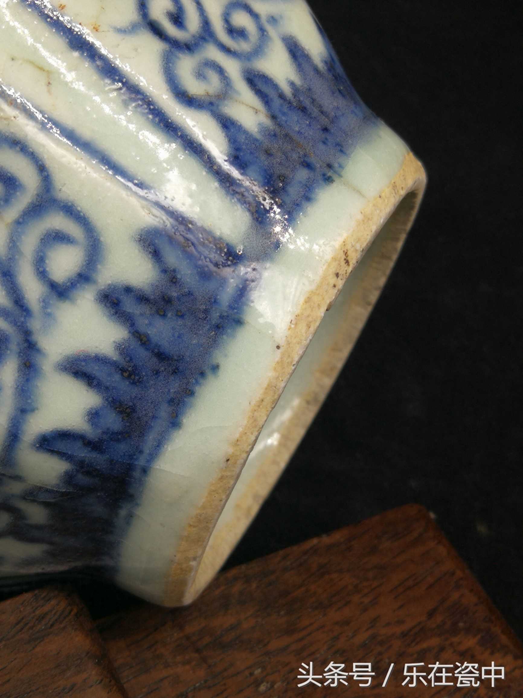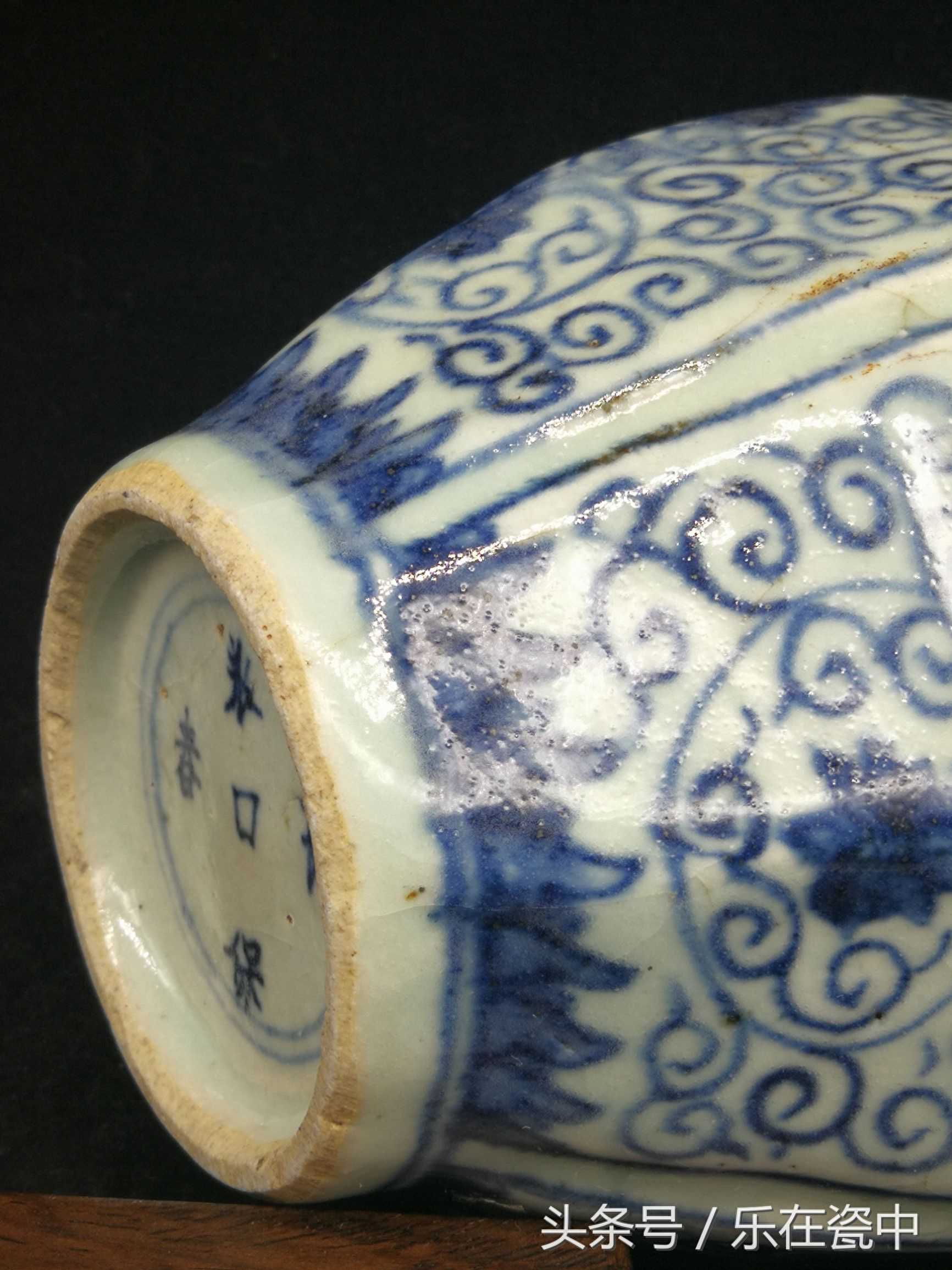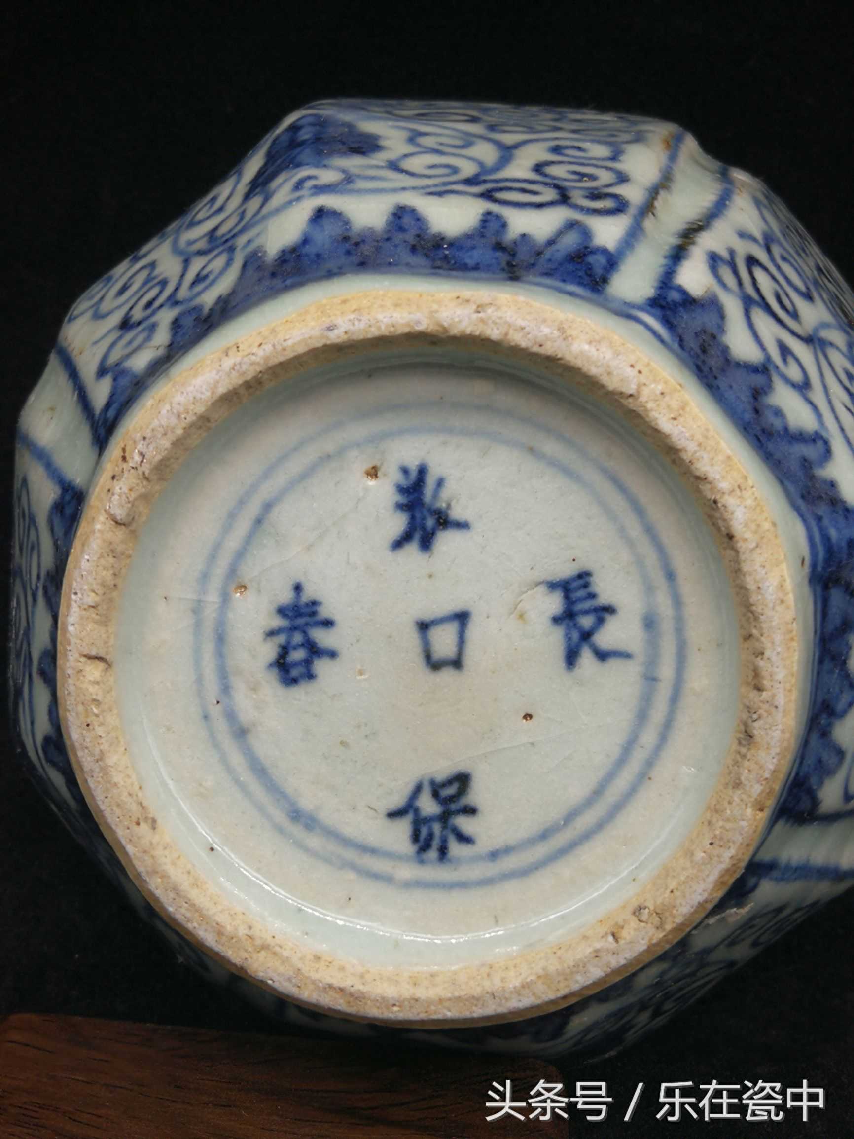 明万历永保长春款缠枝莲青花纹八棱罐。根据笔者对万历民窑瓷器的认识,万历的釉色是乳白色微微闪青。万历早期青花发紫,晚期青花发黑发晕散。