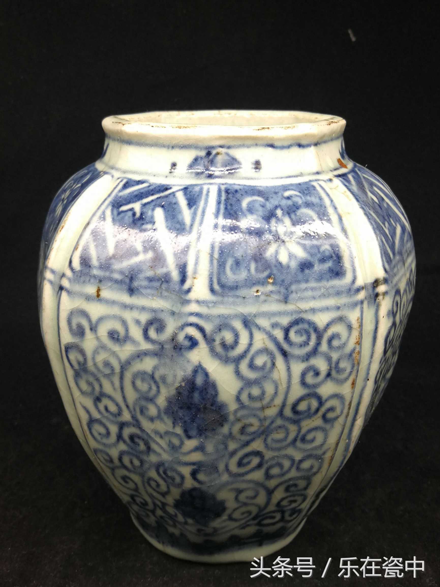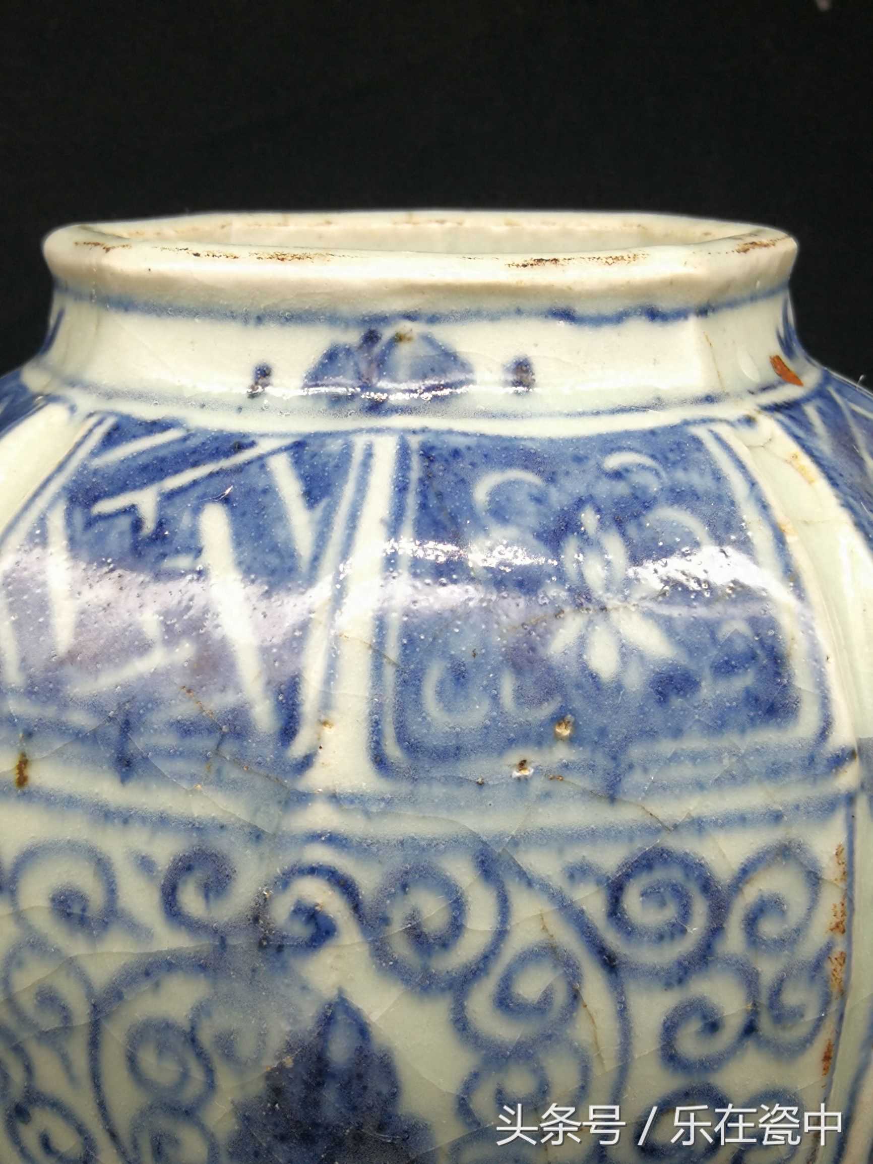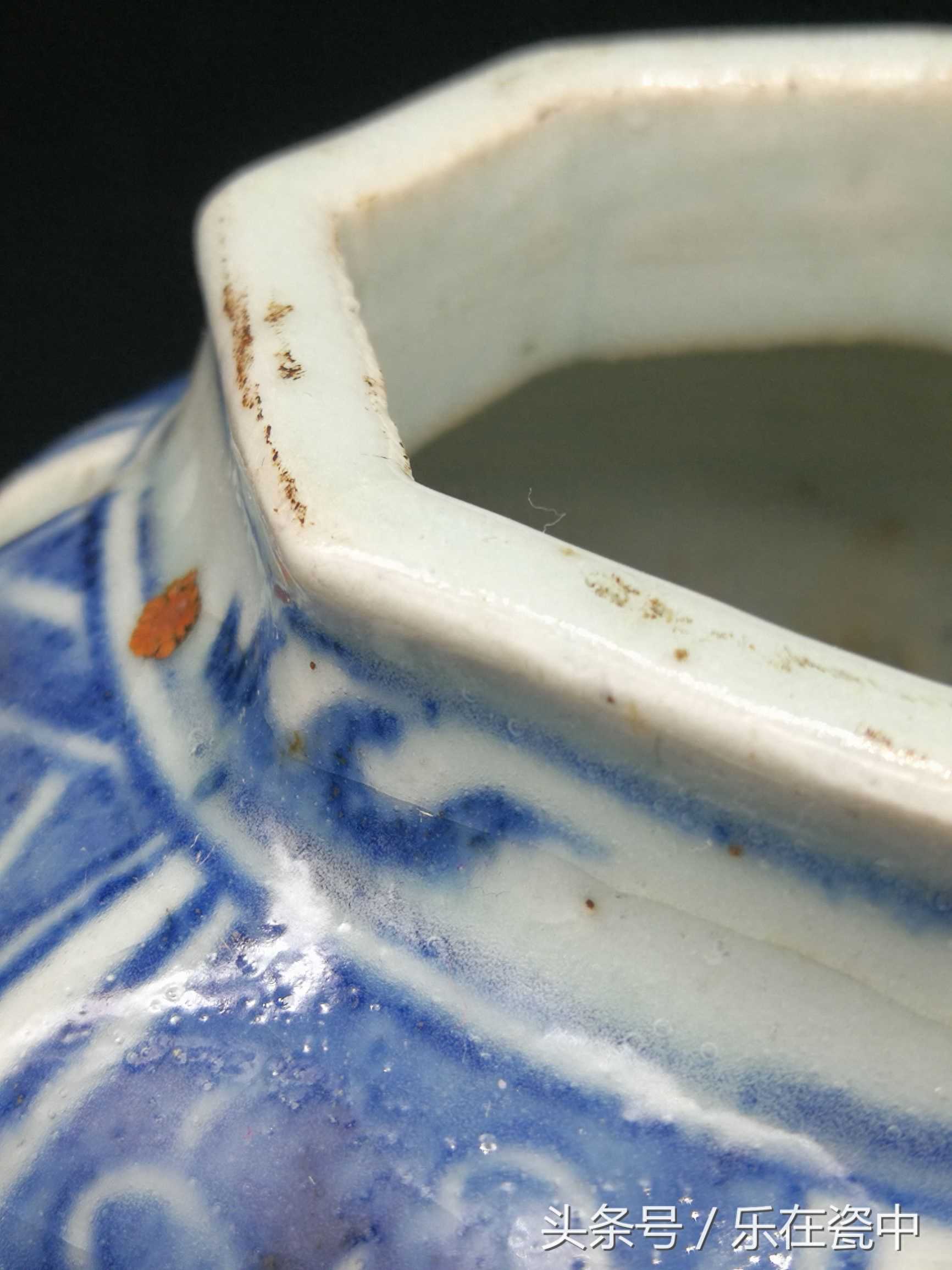明万历永保长春款缠枝莲青花纹八棱罐。根据笔者对万历民窑瓷器的认识,万历的釉色是乳白色微微闪青。万历早期青花发紫,晚期青花发黑发晕散。