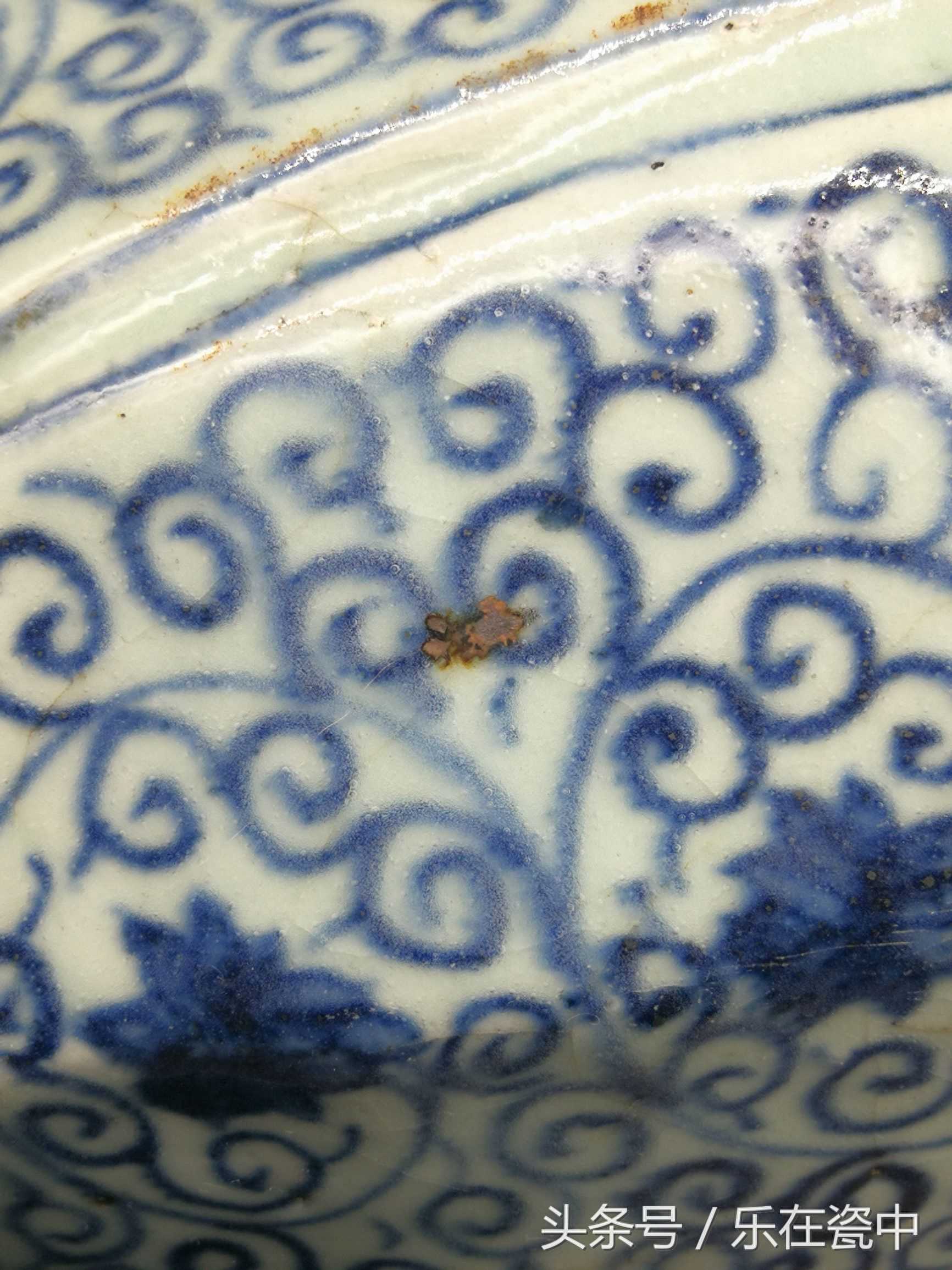 在口沿处磨损痕迹明显。釉面老化痕迹明显,在开片处日积月累进入了污物形成了褐色线。
