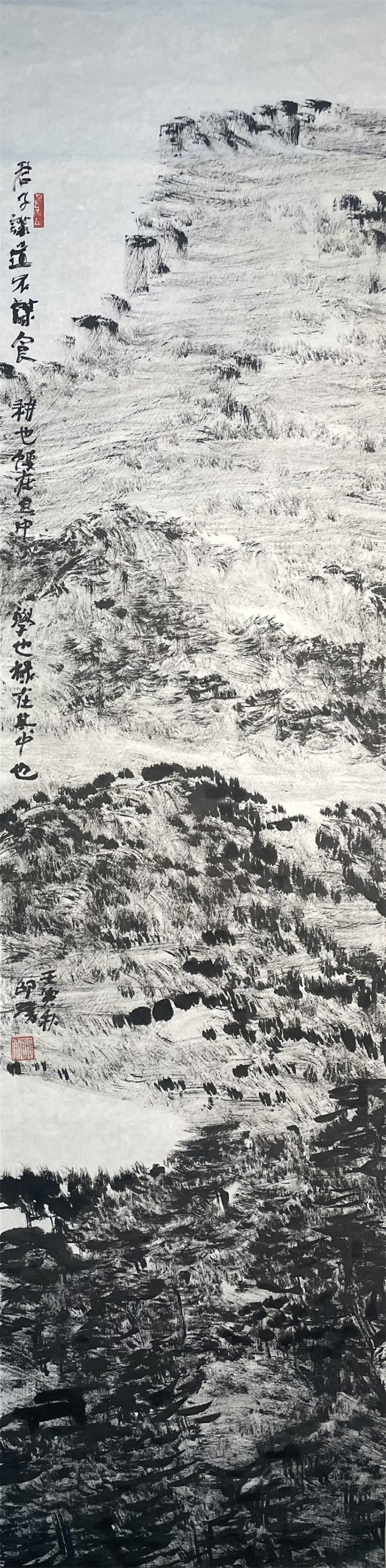 不过在邵璞近期的焦墨画中,那片迷人的灰的指向性有所增加,其笔下的山川草木,更加暗流涌动,使赏画者观之,心潮跌宕起伏;在形体构造上,邵璞的焦墨画也更多人格化处理:那是一座山,可也是一个人,或一个动物,人或动物的一部分、一个动作、一个表情。为赏画者所熟悉的人格化语言,极易打动赏画者的心。只是这指向性的至高点在何处?相信邵璞有一天能够找到,创作出画坛期盼已久的旷世杰作。