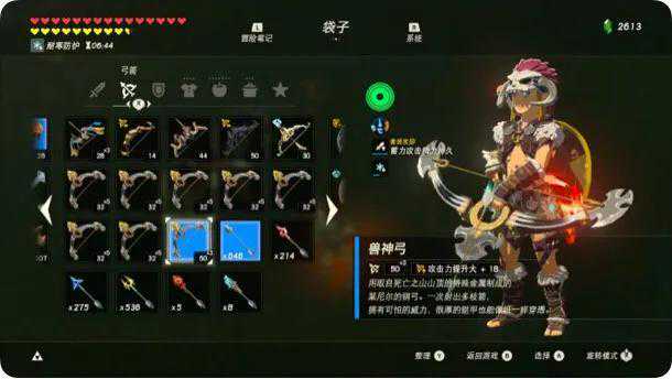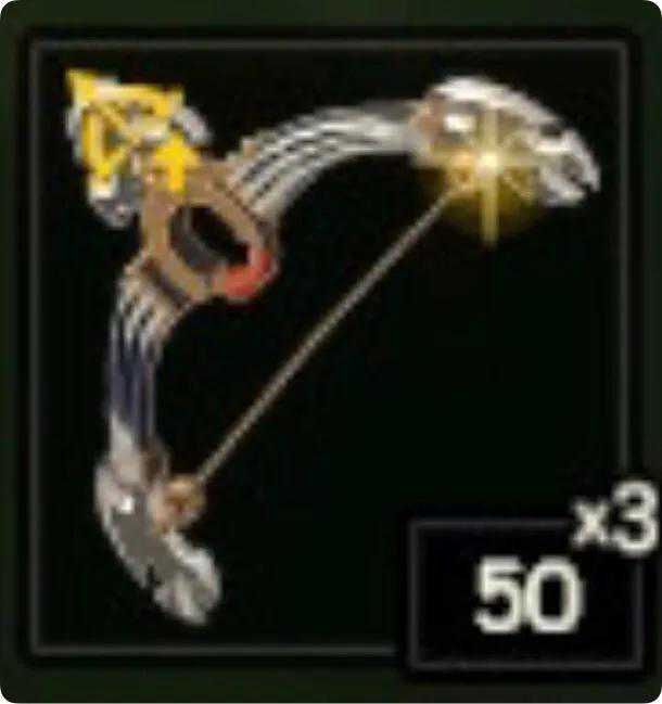 19.兽神弓(50×3)许多人迷恋的神话,不收藏一把50×3的兽神弓,出门都不好意思跟人打招呼,确实比5连弓难出很多倍,但实用性并不优于5连弓,贴脸射人马还是首选5连,毕竟18发带走黄金人马。出去海拉鲁浪一浪,3连弓射程跟射速又不够看,十分矛盾的存在。可能有价值的收藏品都是不实用的东西吧,实用的古董都卖不出好价钱。