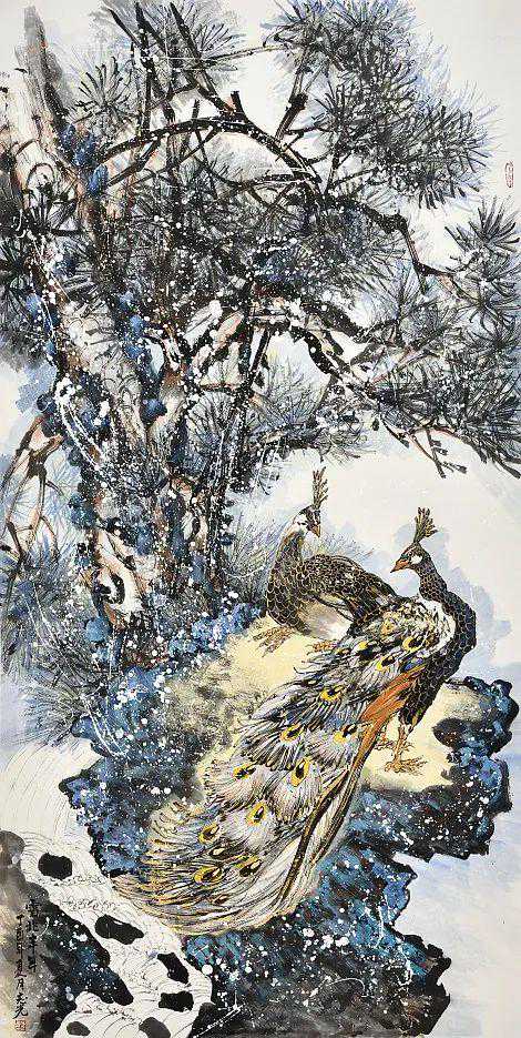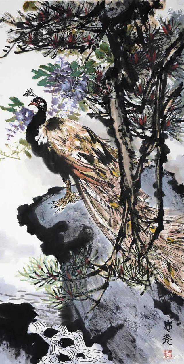 兼工带写法全能,浓墨重彩画丰神。在画坛找一位可以借古开今的花鸟大手笔,冯志光先生可谓是功在其位。浓墨重彩,浑厚华滋,本是山水构造的一种印象,却被雄才可揽的创新能力,介入到花鸟的创作过程当中,让他可以把孔雀画得犹如铁骨侠士,顶天立地。