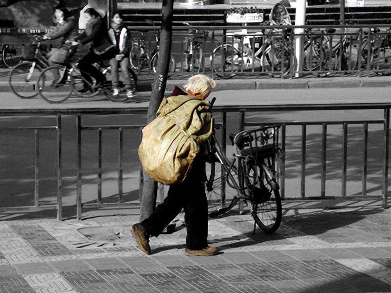 这个拾荒老人也是,不仅自己在街上前行中,后面还拖着长长的大麻袋。