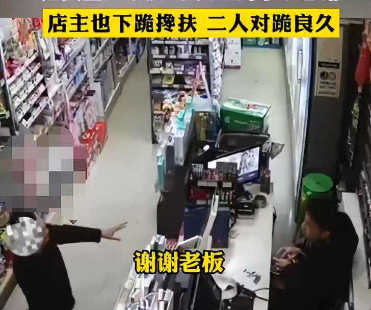 男子跑进店里以后,放下手里的东西,直接向老板跪下了,老板见状吓一跳,连忙冲出去扶男子。