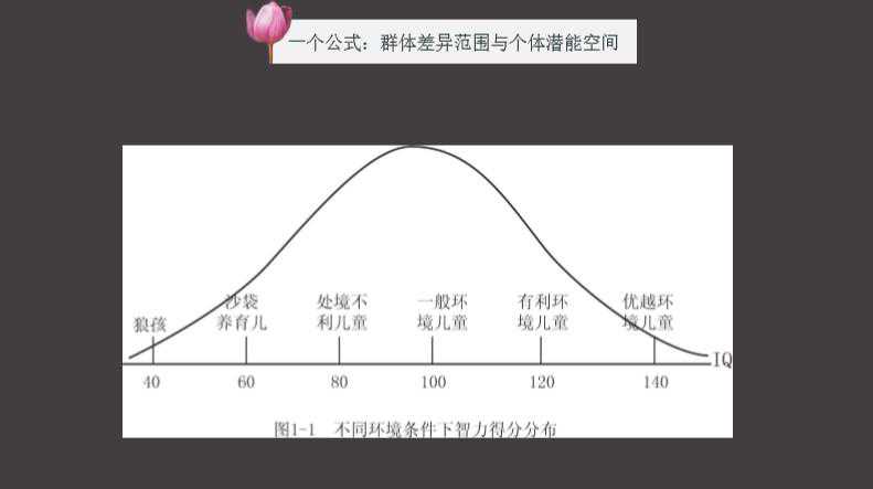 我们今天想把共性拉到人们的视野里来,告诉人们其实我们存在于一个共同的空间,之所以在这里边变化是因为所处的环境不同。如留守儿童与小进行早教、幼儿园教育和家庭教育的孩子相比,智商将出现40分的差异,至少是4个等级。那么早期教育能做的就是让所有的孩子在排除病理外离开100以下。除了遗传差异外,就是家庭差异。无论如何干预,家长之间依旧存在着不同的行为、认知、时间分配等,所以也会带来不同的结论。