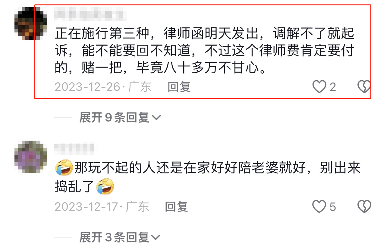 “正在施行第三种,律师函明天就会发出了,一定要去起诉的,毕竟八十多万实在是不甘心。”
