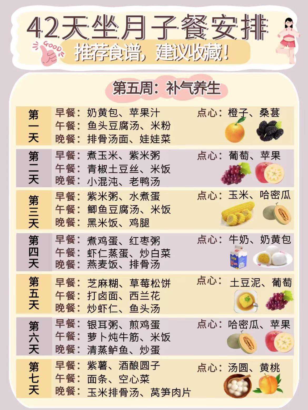 经过前几周的大补,本周可以适当增加一些补益食物,尤其是富含优质蛋白的食物来增强免疫力,后期少吃含油脂高的食物,饮食清淡,有利于身材恢复。