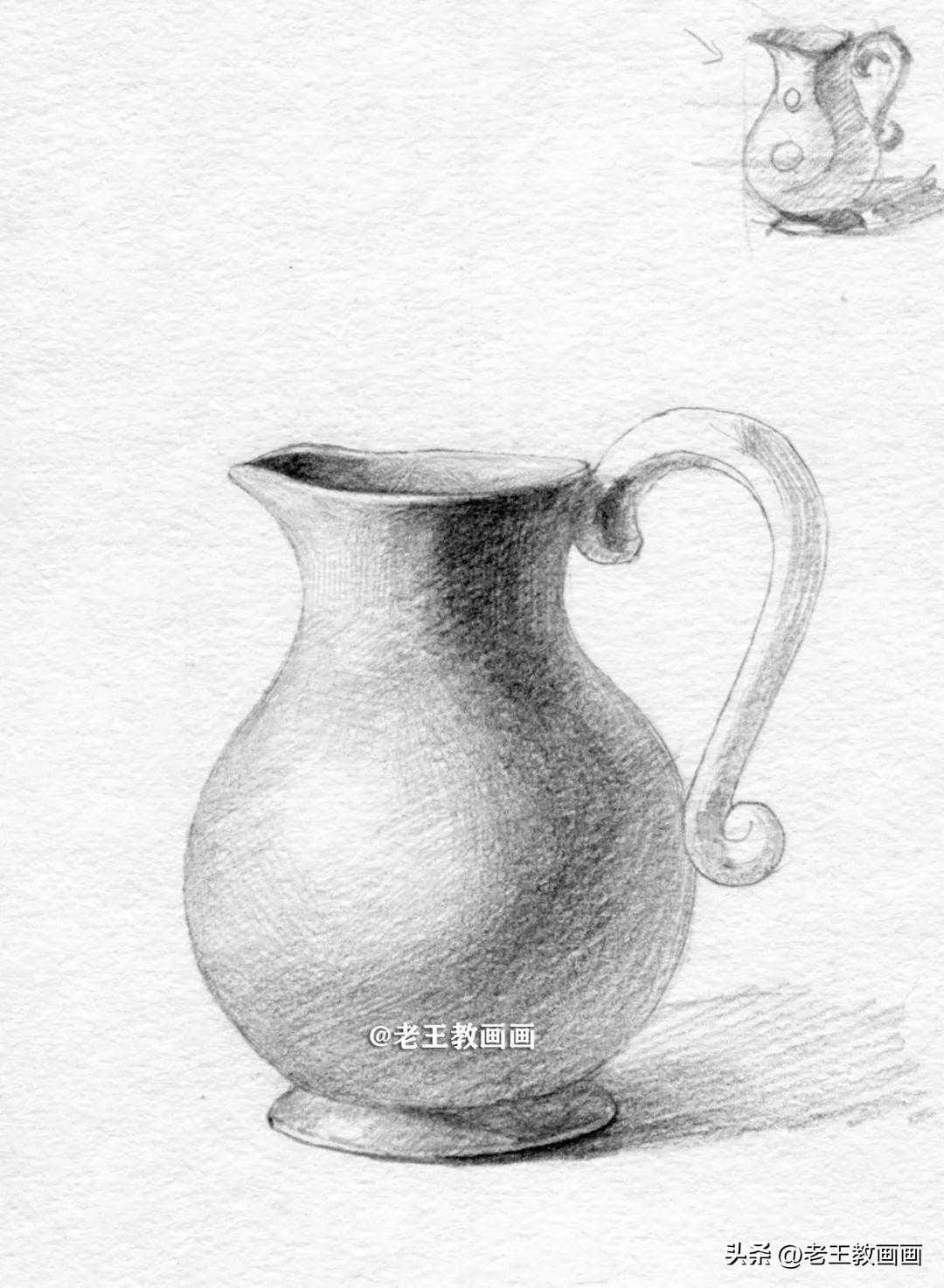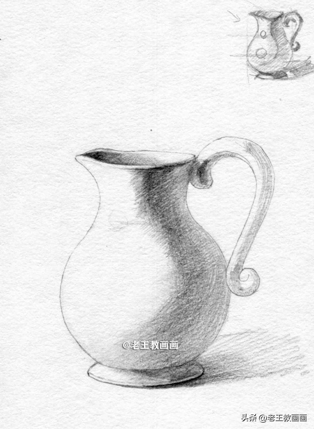 》》》【第5步】:继续用4B铅笔加重罐子把儿的暗部和敏感交界线,注意把儿的结构转折,同时把投影画出来,注意虚实变化,前实后虚,完成(P6↓)
