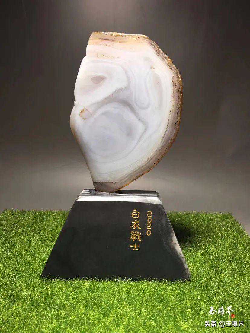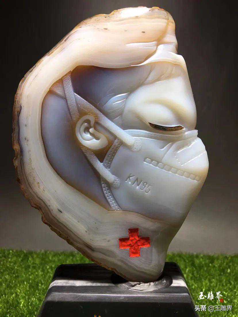 口罩无疑是疫情中的“热词”,一块主基调为白色的特色巴西玛瑙雕出一个医生,白色的口罩,“KN95”字样清晰,被覆盖的脸看不出表情,却可在眼睛上看出信念的坚定,更加值得注意的是,雕刻纹理清晰的口罩带在耳朵处勒出的痕迹,俏色巧妙。