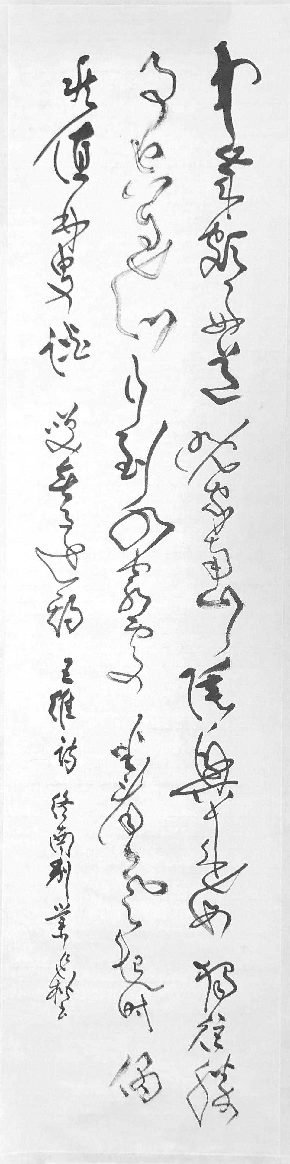 其实,桑先生不但对前辈大师的用笔学得深悟得透,而且用墨也有独到之处。先生曾用温州皮纸四尺条幅创作王维《送綦毋潜落第还乡》,诗句八十字,款识四十余字,竟仅仅一次用墨完成!起笔处墨沉笔实,诗文过半,带燥方润,将浓遂枯,及至后来,笔中几无墨,笔锋杀纸,力透纸背,线条迟涩劲健,枯中见润,无墨见笔。作品一气呵成,诚如东坡所云“非通其意能如是乎”?